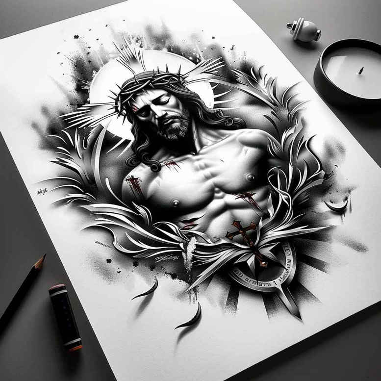 This AI-generated tattoo project presents a bold black-and-grey representation of Jesus, depicted with a radiant halo and a crown of thorns, encircled by a wreath of leaves and twisting branches. The composition blends realism with graphic flourishes, using gradated shading, fine line detailing, and high contrast to make the central figure pop against the ornamental surround. The halo radiates light through crisp linework and soft feathering, while the crown of thorns encircles the brow as a symbol of sacrifice and redemption. The surrounding botanical motif leaves, branches, and a vine-like ripple operates as both frame and pattern, reinforcing the eternal circle of faith. Executed as a single-panel piece in black and grey ink, this design emphasizes depth and texture: smooth gradients in the skin tones contrast with dense blacks in the hair and shading under the jaw, creating a lifelike presence while preserving strong readability at larger scales. The symbolism is intentionally layered: Jesus as divine king; the halo symbolizing sanctity and truth; the crown of thorns marking endurance and sacrifice; and the circular wreath evoking eternity and renewal. The piece is highly suitable for cover-up applications due to its dense black work around the vignette, which can efficiently conceal underlying tattoos while allowing new details to integrate with existing skin tones. For enthusiasts of meaningful tattoos and custom tattoo design, this piece offers a bold statement of faith, a timeless religious icon reimagined with botanical geometry, and a visually arresting study in black and grey realism. The design can be scaled from forearm to chest, adapting the detailed line-work and shading to maintain impact across sizes. It also aligns with modern trends in religious iconography and religious-themed tattoos, while offering flexibility for color or further embellishment if desired. In short, this is a cover-up-friendly, pattern-rich, and spiritually resonant tattoo design that blends reverence with artful technique, ideal for those seeking a permanent reminder of faith through a powerful AI-generated tattoo project.