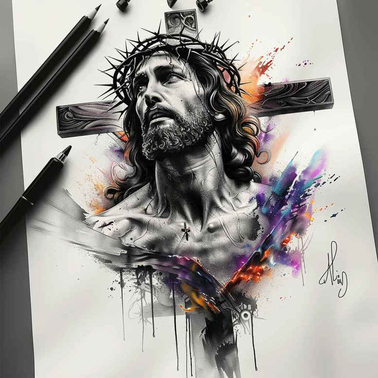 This AI-generated tattoo project presents a reverent study of Jesus on the cross, rendered in grayscale with a crown of thorns and watercolor accents that burst around the figure. The central motif crucifix reads with solemn gravity, while the figure anatomy is handled with fine line tattoo precision to convey humanity and mercy. Behind him, the cross creates depth and a timeless silhouette, anchoring the composition in sacred symbolism. The watercolor splashes introduce color as divine light: cool blues and violet hints mingle with warmer tones, forming an abstract halo that suggests resurrection without sacrificing the sacred mood. The piece blends techniques associated with black and grey realism and contemporary tattoo artistry; the shading uses smooth gradients, crisp edges, and controlled contrast to achieve a lifelike yet painterly quality. Visible elements include Jesus, cross, crown of thorns; the design eschews graphic gore in favor of reverent symbolism, making it suitable for meaningful tattoos and a premium custom tattoo design. Its bold silhouette and rich contrast also lend themselves to cover-up applications, as darker areas can be integrated with existing ink while the watercolor accents help blend lines and soften transitions. The concept borrows from Japanese style tattoo composition, with a nod to fine line and tribal tattoo aesthetics, and even hints of lotus flower tattoo and rose tattoo design in the peripheral splashes, offering subtle floral echoes for those seeking flower tattoos. The piece remains versatile for small tattoos or large backpieces, and can be adjusted for placement with ink choices tailored to personal devotion and story. As an AI-generated tattoo project, it demonstrates how sacred iconography can be translated into tattoo design while preserving meaning, elegance, and visual impact across body art, ink, and meaningful tattoos.