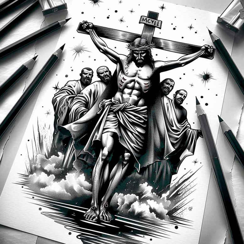 This AI-generated tattoo project centers on the sacred scene of Jesus on the cross, flanked by mourning figures, set against a stormy grayscale landscape. Rendered in black and grey with careful contrast, the composition relies on dramatic light and shadow to heighten reverence and solemnity. The central cross commands attention, while the surrounding silhouettes evoke the weight of sacrifice and redemption. Clouds brood overhead and radiant beams break outward, creating a sense of divine presence that is further enriched by subtle star-like accents to add depth without diminishing the spiritual gravity. The design embraces graphic shading patterns to provide texture and a cinematic mood, allowing for bold line work or refined fine-line touches depending on scale. As a custom tattoo design, this piece can be adapted to various placements such as sleeve or back, preserving the crucifix’s readability while leaving generous negative space for future additions. Given its very dark tonality, it is a prime candidate for a cover-up, where existing ink can be integrated into the cross silhouette or masked by the surrounding shadows. The symbolism is timeless: sacrifice, mercy, and faith rendered through monochrome ink that communicates weight and hope. For clients seeking meaningful tattoos, this piece aligns with themes of devotion and resilience; it also serves as a flexible canvas for pattern work or ornamental halos if desired. In today’s AI-assisted design landscape, this project demonstrates how traditional religious imagery can translate into modern body art without losing spiritual gravity. Keywords to consider include tattoo design, meaningful tattoos, black and grey, realistic tattoo, and custom tattoo design, with optional references to lotus or floral accents later; the core motif remains the crucifix and the vigil of the figures, a powerful story drawn in monochrome.