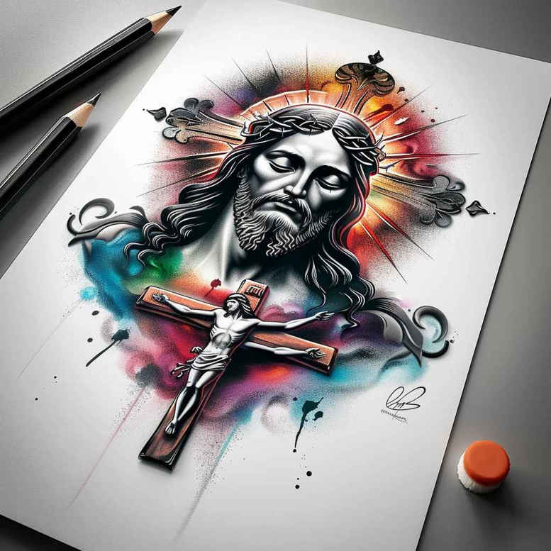 This concept centers on a luminous Jesus crucifix, rendered in a dynamic watercolor style that merges sacred iconography with contemporary tattoo aesthetics. The crucifix forms the backbone of the composition, its wooden beam tinted with a subtle grain and drenched in restrained red tones to evoke sacrifice and devotion. Overlayed upon the cross, the figure of Jesus is rendered with soft, gestural brushwork that suggests movement and faith rather than literal precision, while a radiant halo blooms above his head in soft golds and whites, signaling divinity and eternal grace. Surrounding the sacred scene, an explosion of blue, indigo, and orange watercolors radiates outward like a spiritual beacon, defracting light into the skin and giving the piece a vibrant, painterly energy. The contrast between the dark linework and the luminous pigments helps the central symbols stand out while maintaining a harmonious balance between reverence and modern tattoo artistry. The technique relies on layered washes, fine line outlines, and subtle drip effects to imitate traditional watercolor on skin, a style favored in contemporary tattoo design for small to large pieces alike. Symbolically, the crucifix honors sacrifice; the Jesus figure embodies compassion, redemption, and victory over death, while the halo reinforces divine authority and sanctity. The color palette can be tuned for personal meaning—cool blues may signify serenity and faith, warm oranges can denote courage and resurrection—making this a meaningful tattoo design for anyone seeking a bold yet spiritual statement. Although conceived as an AI-generated tattoo project, the design remains adaptable for tattoo studios seeking a custom approach, with room for fine-tuning line weight, shading, and scale. In sum, this Jesus-centered cross tattoo blends sacred symbolism with contemporary color and motion, offering a memorable, statement-making piece suitable for fashioning a powerful cover for those seeking a transformative religious body art experience.