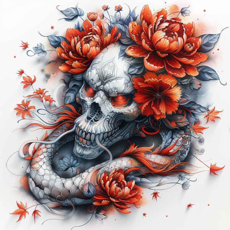 This AI-generated tattoo project presents a dark, watercolor-inspired composition featuring a skull entwined with crimson roses, shaded in blue-gray to create moody depth. The central skull is rendered with crisp outlines and soft washes, while the roses blaze with saturated red petals and cooler blue-green leaves, delivering a painterly yet legible silhouette that translates well to both small tattoos and larger canvases. The design leans toward a realistic tattoo aesthetic fused with fine line details, enabling precise line work and smooth color transitions that preserve clarity as ink settles. The color palette blends bold florals with restrained shading so that the skull remains the focal point while the surrounding blossoms provide movement and balance. This piece works equally well as a rose tattoo design or as a broader flower tattoo, and it can be executed in black and grey for a more classic look or in full color for a vibrant statement. For clients seeking cultural motifs, it can be adapted to Japanese style tattoo conventions or traditional tattoo references while maintaining the core skull-and-flowers motif. The cover-up potential is substantial: a dark foundation around the skull can mask older ink or scars, while the floral overlay is positioned to soften edges and offer new texture, making it an ideal cover-up project. This concept showcases the capabilities of AI-generated tattoo projects to spark dialogue with artists, serving as a starting point for custom tattoo design conversations and scalable body art that balances meaning with visual impact. In summary, the piece marries life and mortality symbolism with modern color theory, offering a meaningful tattoo design that resonates for lovers of ink, and stands ready to evolve into a unique, finished work.