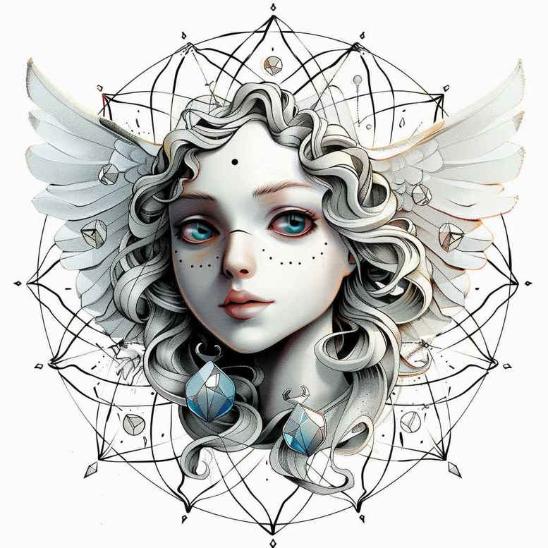 This AI-generated tattoo project presents a contemplative portrait of a young woman, centered by a halo of geometric symmetry. The face is rendered in black and grey with meticulous fine-line shading, capturing delicate features, soft shading around the nose, lips, and cheeks, and a calm gaze that invites reflection. Her wavy hair frames the composition, while a pair of wings emerges behind her, blending natural form with angular geometry. A mandala-like circle and interlaced lines radiate outward, suggesting sacred geometry and structure without overwhelming the portrait. At the base of the neck, a small beaded pendant—rendered in cool blue tones—adds a focal point and contrast to the grayscale palette. The overall design emphasizes balance between organic portraiture and precise linework, typical of fine line tattoo techniques. The geometric circle pattern background enhances depth and creates a sense of motion, while the subtle emphasis on line weight and shading demonstrates a realistic tattoo approach within a black and grey scheme. This concept invites interpretation: it could symbolize protection, transformation, and the union of spirit and intellect, with the wings representing ascent and the circle representing continuity. As a global concept of a modern tattoo design, it fits well as a small to medium-sized piece and can be adapted to different placements; its clean lines and geometric framework make it particularly suitable for a cover-up if needed, and it leans into the aesthetics of Japanese style tattoo through disciplined line work and restraint. In short, this is a meaningful tattoo design that leverages fine-line, geometric and portrait elements to deliver a striking body art piece, a versatile choice for those seeking a custom tattoo design with black and grey ink and blue accent beads. This remains an AI-generated tattoo project.