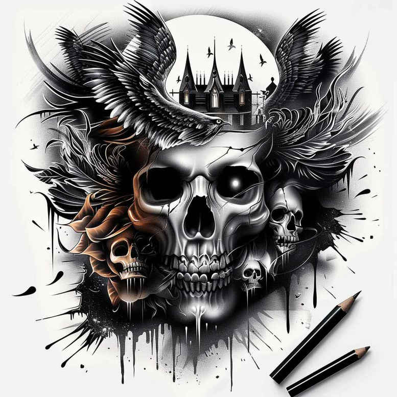 This AI-generated tattoo project presents a high-contrast, self-contained composition that pairs a menacing skull with a medieval castle silhouette beneath a full moon. The central skull is rendered with dense line work and smooth gradient shading to achieve a lifelike presence, while delicate fine-line details emphasize teeth, orbital sockets, and subtle bone structure. On either side, wing-like feather motifs curl outward, creating a dynamic frame that guides the eye toward the castle spires rising behind the skull. A spray of ink splatter radiates from the core of the scene, introducing a graphic pattern that enhances movement and texture and making the piece visually bold even at smaller sizes. The background remains intentionally restrained, allowing the moon to glow as a source of negative space and contrast, which amplifies the dramatic mood and emphasizes the theme of cycles and endurance. Executed in black and grey, the design relies on value shifts, stippling, and crisp edge work to deliver depth, tone, and a sense of weight that is suitable for both compact tattoos and larger canvases. The piece nods to gothic and traditional influences while staying firmly within a modern realism approach, making it versatile for a cover-up by concealing prior ink with solid blacks and rich shading. For viewers seeking meaningful tattoos, the skull can symbolize mortality and transformation, the castle protection and steadfastness, and the moon illumination and reflection, all of which align with the broader themes of ink, body art, and personal narrative. As an AI-generated tattoo project, it demonstrates how digital concepting translates into a tangible tattoo design that remains highly adaptable to placement, orientation, and skin tone, and its dark composition particularly suits cover-up applications where existing markings require concealment and a bold rebrand with timeless appeal. In short, this is a striking, pattern-rich black-and-grey tattoo design idea that marries dramatic imagery with practical cover-up potential and the refined artistry of realistic tattooing.