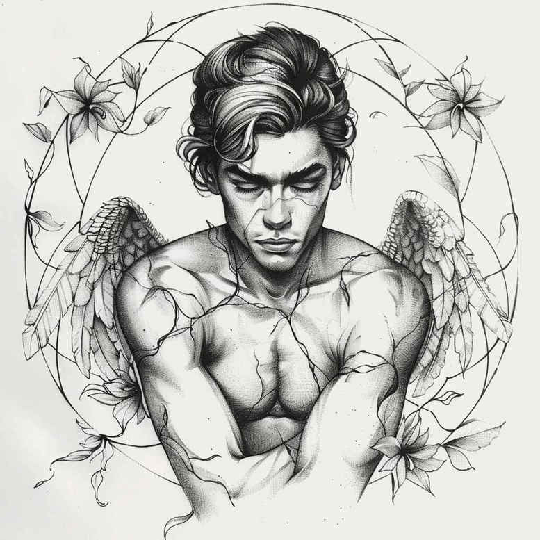 This AI-generated tattoo project concept presents a bold black and grey composition: a muscular man with outstretched arms and wings enclosed by a thorned circle. Executed in fine line technique with restrained shading, the study reads as a realistic tattoo design that straddles classical figure drawing and contemporary body art. The central anatomy is rendered with precise line work and subtle gradients to retain clarity on skin while allowing for scalable reductions or expansions, making it suitable for a cover-up when needed but equally potent as a standalone piece. The thorn circle supplies a decorative yet aggressive boundary, offering negative space that technicians can exploit during placement and healing, and serving as a ready canvas for future motifs such as lotus flower tattoo accents, infinity tattoo symbols, or tribal elements should the client desire a larger sleeve or back piece. Symbolically, the image conveys strength, protection, and metamorphosis—qualities often sought in meaningful tattoos—while remaining flexible as a tattoo design for black and grey realism or color conversion. From a stylistic perspective, the picture aligns with fine line and Japanese-inspired restraint, yet it remains adaptable to small tattoos or expansive back work, making it a versatile template for a custom tattoo design. As an AI-generated concept, it demonstrates how modern algorithms can yield coherent, body-friendly compositions that professional tattoo artists can translate into ink. This concept thus bridges digital design and hand-crafted tattoo artistry, offering a bold, elegant motif that emphasizes line clarity, anatomical accuracy, and durable contrast for long-lasting black and grey skin art, and it is particularly suitable for cover-up projects when existing marks need concealment. The design invites adaptation: wings length, circle thickness, and thorn density can be tuned; it supports both small tattoos and larger formats, including potential Japanese style reinterpretations and extensions for sleeve or back pieces.