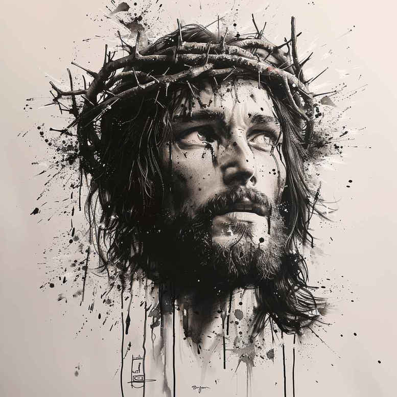 AI-generated tattoo project presents a dramatic Jesus portrait rendered in black and grey ink with crown of thorns and flowing hair. The design blends precise linework with expressive splatter and brush-like shading, creating a bold, modern interpretation of our greatest King. Key elements include the central figure of Jesus, the crown of thorns encircling the head, hair and beard framing a solemn gaze, and an intentional ensemble of ink splatters that radiate outward, suggesting both suffering and grace. The composition uses negative space to emphasize the face, while the splatters introduce texture and movement, giving the piece a dynamic, graphic realism within a painterly, contemporary body art piece. The motif speaks to reverence, sacrifice, and redemption, turning a traditional icon into a contemporary tattoo design statement. This tattoo design is suitable for larger canvases on the chest or back, leveraging black and grey shading to achieve depth and contrast, while its dark tones also make it a strong candidate for a cover-up on older work. Because this is an AI-generated project, the draft blends classic symbolism with modern techniques, offering a meaningful tattoo design that can be adapted into fine line, bold, or realistic ink styles depending on skin tone and preference. Keywords to guide search include tattoo, tattoo design, meaningful tattoos, fine line tattoo, lotus flower tattoo, infinity tattoo, tribal tattoo, rose tattoo design, small tattoos, flower tattoos, custom tattoo design, Japanese style tattoo, black and grey, realistic tattoo, body art, ink.