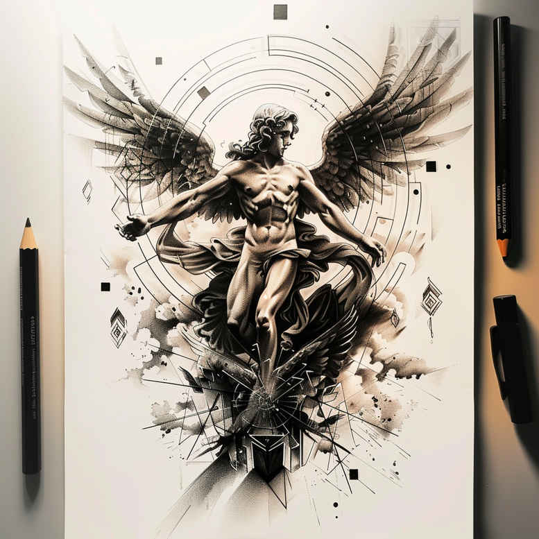 AI-generated tattoo project presented as a single, bold composition: a central angel figure with a spreading halo and a surrounding circle pattern, rendered in black and grey with dynamic ink splashes. The design leans toward a graphic, illustrative style that blends strong contour lines with soft shading to create depth on the skin, balancing realism and myth. The angel’s form is monumental yet serene, symbolizing protection and guidance, while the halo and circle motif evoke cycles, continuity, and personal meaning. Behind the figure, geometric rings and radial lines frame the silhouette, enhanced by wisps of negative space that preserve legibility for future sessions. The piece reads as a cover-up-ready work due to dense black work and deliberate shadows that can effectively obscure older tattoos, making it ideal for cover-up projects. Technique-wise, it combines bold line work with smooth gradients, stippling accents, and layered grayscale washes to achieve dimensional realism in black and grey tattoo aesthetics. For tattoo design inspiration, the concept invites the integration of lotus or rose motifs within the halo or circle, and accommodates infinity or tribal elements for personalization. As an AI-generated tattoo project, it demonstrates how algorithmic creativity translates into refined body art concepts that respect placement, skin tone, and aftercare realities. The overall effect is a dramatic, pattern-rich tattoo design that merges mythic iconography with modern graphic flair, suited for cover-up transitions and adaptable to Japanese style or realistic line work if desired. This description weaves in keywords for search optimization—tattoo, tattoo design, meaningful tattoos, fine line tattoo, lotus flower tattoo, infinity tattoo, tribal tattoo, rose tattoo design, small tattoos, flower tattoos, custom tattoo design, Japanese style tattoo, black and grey, realistic tattoo, body art, ink—while staying faithful to the visual essence of the piece. Artists can tailor shading density, adjust halo diameter, or modify circle geometry to suit arm, back, or chest placements, and the base concept remains versatile for both bold back-piece statements and refined forearm silhouettes.