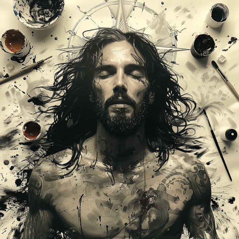 AI-generated concept: a dramatic black and grey portrait of Jesus rises through painterly splatters, merging sacred symbolism with modern tattoo artistry. The composition relies on strong chiaroscuro to carve the features; the deep blacks of hair and beard frame a luminous gaze, while midtones and soft grays model the planes of the cheeks, brow, and lips, allowing the expression to resonate on skin. Across the portrait, spray-like splatters and brush-stroke textures sweep the frame, suggesting struggle, salvation, and renewal without obscuring the sacred focal point. The effect is both raw and refined: realism anchors the image in a believable likeness, while the deliberate chaos of splatter gives a contemporary edge appropriate for a cover-up concept. The symbolism centers on sacrifice, mercy, and forgiveness, which many wear as a personal reflection of faith, memory, and hope. Implemented as a tattoo design, this concept adapts to large canvases such as back or chest with bold negative space and refined line work, yet remains legible as a smaller forearm piece through careful scaling of details. The piece translates well to black and grey tattoo workflows, using stippling for texture, smooth gradient shading, and controlled splatter to preserve clarity during healing. This is an AI-generated tattoo project, created to explore meaningful tattoos that honor Jesus while embracing contemporary body art. For variations, keywords such as tattoo design, meaningful tattoos, black and grey realism, realistic tattoo, and custom tattoo design help tailor the concept to different placements and personal devotion. You can add crowns, halos, or lotus accents to personalize while keeping the sacred core intact. It also invites reflection on grace amid darkness, making it a durable and spiritually resonant choice for meaningful tattoos.