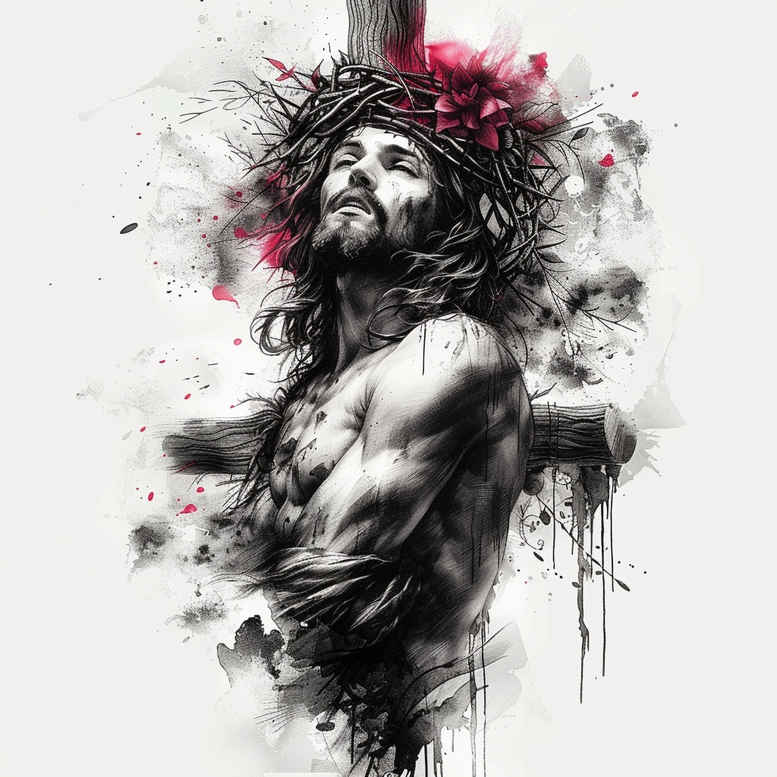 This AI-generated concept presents Jesus on the cross rendered in black and grey with a crown of thorns and explosive ink splashes that echo a dramatic, watercolor-inspired finish. The composition centers the suffering figure in high-contrast shading, with the cross fading into a mist of splatter that suggests both movement and endurance. The crown of thorns emphasizes sacrifice, while the surrounding stains symbolize life, blood, and redemption, a visual language that turns a spiritual moment into a personal, wearable meditation. Executed in a refined black-and-grey palette, the piece blends realism in the figure with expressive patterning in the background, making it suitable for a bold, cover-up-ready tattoo project. Through the interplay of light and dense shadow, the design communicates a tale of faith, resilience, and grace, inviting the wearer to reflect on meaning while carrying a powerful religious symbol. For tattoo lovers, this design blends classic iconography with contemporary ink techniques—a meaningful tattoo, a strong silhouette, and a pattern-rich surface that can be scaled for placement on arm, chest, or back. It embraces tattoo design vocabulary like fine line hints, broad shading, and subtle transitions that read well in both black and grey and color-restrained contexts. The image also nods to various tattoo genres, from realistic black-and-grey portrait cues to abstract splashes that render the scene as a living painting. This is an AI-generated tattoo project, conceived to explore cover-up potential and to offer a meaningful option for those seeking a deeply symbolic, enduring piece. If the client desires, additional elements like a halo, script, or floral accents can be incorporated in a custom tattoo design, while preserving the core imagery and the story it carries.