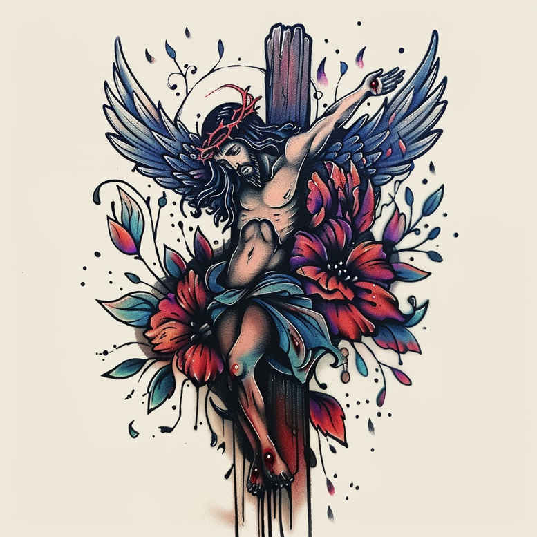 AI-generated tattoo project presenting a Jesus-inspired winged saint motif, rendered in a vibrant watercolor style. The central figure is a celestial guardian whose outstretched wings crown the figure, creating a sense of uplift and protection. The robe flows in cool blues and teals, while a ring of crimson flowers forms a radiant floral halo behind the head; green leaves weave through the composition, suggesting renewal. Fine line shading defines the face with serene expression, and the wings are etched with delicate feather detail that catches light against the saturated background. Ink splashes and splatters provide an organic texture, blending painterly wash with crisp outlines to keep legibility on skin. The halo glints softly, a visual cue of sanctity, while the floral motif serves as a wreath of devotion and sacrifice, expressing the intersection of mercy and tenderness central to Christian belief. This design frames Jesus as a messenger and protector rather than a portrait, inviting interpretation as a symbol of guidance, faith, and divine artistry. The color palette balances cool tones with warm accents, creating depth and contrast that will age gracefully in black and grey or full color options, depending on skin tone. The assembly of botanicals and watercolor gradients evokes both Japanese and Western sacred-art influences, yielding a contemporary, versatile tattoo design suitable for custom placement on the arm, back, or chest. As an AI-generated tattoo project, it welcomes adjustments in line density, scale, and saturation to honor wearer preferences and skin characteristics; it preserves readability at different sizes and remains meaningful as a lasting body art piece.