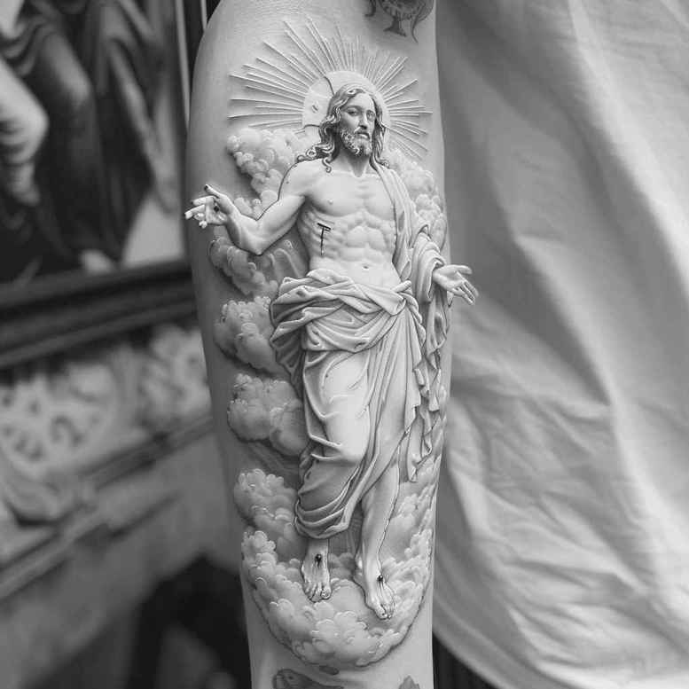 AI-generated tattoo project presented as a reverent study of Jesus in a classic, timeless pose. The central figure is rendered in black and grey realism, with a lifelike Jesus standing with open arms or blessing gesture, his robe cascading in rich folds that catch light through careful shading. A subtle halo crowns the head, lending sacred presence without overpowering the form. The overall composition emphasizes mass, structure, and luminous negative space, making the piece adaptable to different placements such as the upper arm, chest, or back. The shading transitions from crisp outlines to soft gradients, designed to maintain legibility on various skin tones and to preserve integrity when used as a cover-up over darker tattoos. The symbolism is carefully woven: sacrifice and compassion expressed through the gesture of blessing, mercy reflected in the calm facial expression, and the halo as a beacon of faith. The technique leans into realism while honoring traditional sacred iconography, achieving depth through layered blacks, midtones, and gentle highlights that evoke stone sculpture and carved relief. This is an AI-generated tattoo project, illustrating how digital drafts can inform custom tattoo design with precision and consistency, guiding tattoo artists toward refined line work and tonal balance. For those seeking meaningful tattoos, the concept offers a robust foundation for a modern sacred portrait that remains respectful and contemplative. It also invites extensions—additional figures, supporting symbols like crosses or doves, or integration with other motifs such as lotus or infinity—to create a larger narrative while preserving the central Jesus portrait. Ultimately, the piece stands as a versatile body art statement, a timeless meditation on faith, resilience, and grace, and a strong candidate for a cover-up where darker inks exist, thanks to its bold silhouette and adaptable shading.