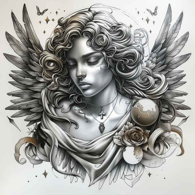 This is an AI-generated tattoo project illustrating a classical angel portrait rendered in black and grey realism. The central figure is a poised angel, her serene face framed by flowing curls and a pair of expansive wings that extend outward with meticulous feather delineation. A slender necklace with a tiny pendant rests at her throat, and a draped robe folds across her chest and shoulders, adding elegant negative space and gentle motion. Two roses anchor the composition—one near the shoulder and another tucked beneath the fabric—symbolizing remembrance, purity, and enduring love. The design leans into strong silhouette and tonal contrast; the black ink gradients create depth in the face, while fine line work defines the hair, petals, and feather textures, giving the piece a lifelike quality. The overall mood blends classical sculpture with modern tattoo technique, employing smooth shading transitions, crisp outlines, and subtle stippling to add texture without compromising legibility on skin. While the image is an AI-generated tattoo project, the concept translates well to a large-scale body art piece, suitable for placement on the back or chest where it can be rendered with an emphasis on negative space and gradual shading. This tattoo design offers a meaningful narrative: protection, guidance, and beauty intertwined with florals, making it attractive to those seeking a rose tattoo design or a guardian angel motif in a realistic black and grey palette. For clients, the piece provides a solid foundation for a custom tattoo design—capable of adaptation into Japanese-inspired or traditional Western styles, with potential for a small tattoo adaptation if desired. In sum, the concept showcases elegant realism, timeless symbolism, and a versatile composition ideal for meaningful tattoos and enduring body art. Color nuance can be adjusted to suit skin tone, with the grayscale range tuned for deeper contrast or softer transitions. The concept invites collaboration with the tattoo artist to tailor line density and shading to individual anatomy. In terms of market appeal, the design aligns with black and grey realism trends, floral accents, and spiritual iconography, appealing to those seeking meaningful tattoos and refined body art.