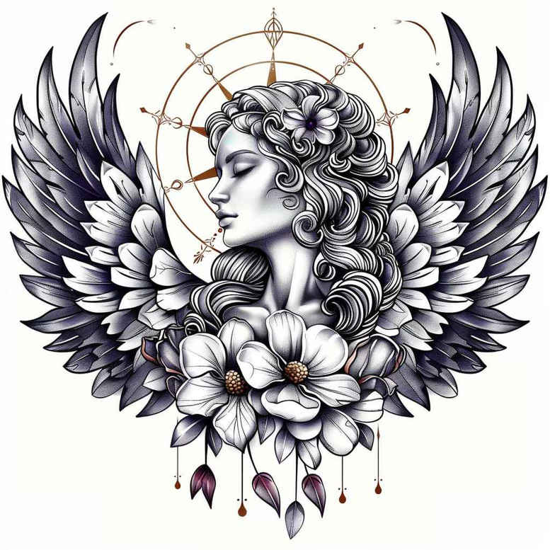 This AI-generated tattoo project concept presents a refined black and grey, fine line tattoo design featuring a winged woman in profile, her hair cascading around a pair of large lilies, all set against a circular mandala backdrop whose concentric rings and delicate linework create an airy, geometric frame. The wings are rendered with meticulous feather detail and subtle stippling that yield a soft gradient against the figure, balancing strength and grace. The composition blends a heraldic silhouette with botanical grace: a symbolism-rich pairing that suits meaningful tattoos, adaptable to small tattoos or a larger shoulder, chest, or back piece depending on scale. The circular mandala behind her head evokes unity and protection, while the lilies symbolize purity, renewal, and beauty, inviting contemplation of life’s cycles. Executed with fine line control, precise black ink, and restrained shading, the work relies on clean outlines, light crosshatching, and whisper-thin gradations to preserve legibility as body art over time. As a custom tattoo design, it offers versatility for placement along the collarbone, upper arm, or back, resonating with themes of freedom (wings), transcendence, and nature. The AI-generated origin is acknowledged, presenting a modern, design-forward concept suitable for clients seeking a refined, realistic tattoo approach that emphasizes texture in feathers and petals while maintaining clarity in a black and grey palette. Potential variants include lotus flower tattoo or rose tattoo design adaptations, should the client desire a different floral motif while preserving the overall structure and symbolism. This piece embraces a restrained Japanese-style balance of white space and line weight, reinforcing the notion that bold imagery can emerge from delicate linework, and it serves as a versatile reference for those exploring meaningful tattoos with floral accents and mythic resonance. Viewed as a study in contrast, negative space defines the wings and petals, while the figure’s gaze anchors the composition, making it suitable for intimate placements or bold back pieces.