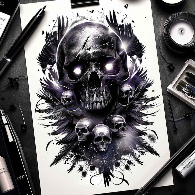 AI-generated tattoo project concept presented in a professional magazine tone, exploring a dark, highly detailed study of mortality and growth through a central skull complemented by a stylized bloom. Rendered in black and grey with selective purple accents, the composition rests on a sheet of paper, surrounded by ink bottles, brushes, and a pen, grounding the design in a traditional tattoo workflow. The skull is shaded with precise cross-hatching and smooth gradient transitions to achieve a lifelike texture, while the bloom offers organic movement and a sharp contrast to the gravity of the skull, inviting contemplation of resilience and renewal. The layout prioritizes a strong focal point—the skull—while the bloom frames and softens the composition, making it adaptable for placements from small forearm tattoos to larger back pieces. The included ink and tools not only set the scene but symbolize the craft behind tattoo design, reinforcing the idea that this could evolve into a custom tattoo design tailored to a client’s anatomy, skin tone, and personal meaning. As a template for a tattoo project, the concept blends graphic realism with botanical elegance, allowing a wearer to encode meanings such as memory, transformation, and strength into a single, coherent motif. Its cover-up potential is highlighted by dense shading and rich black areas that can mask previous ink while the purple bloom provides a readable focal point. This AI-generated tattoo project concept demonstrates how an artist might translate a studio sketch into a final tattoo design, emphasizing the interplay between line work, shading, and negative space, and underscoring the potential for a unique, meaningful tattoo that couples classic iconography with contemporary floral elements. The design nods to cross-cultural tattoo traditions by merging skull imagery with floral symbolism, and the grayscale base can be enhanced with color accents for personal meaning; motifs such as lotus flower tattoo and rose tattoo design can be integrated in the floral element, aligning with trends in flower tattoos and Japanese style tattoo aesthetics. For small tattoos, the piece translates to fine line details with crisp contours, while a larger format can expand the bloom into a dynamic bouquet, preserving legibility over time.