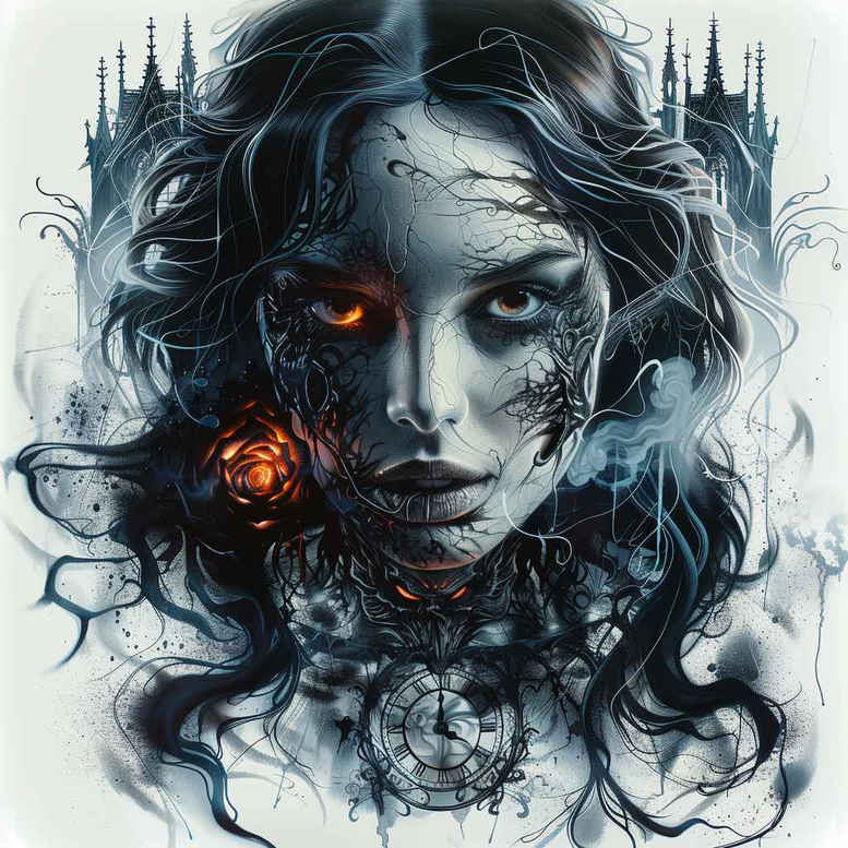 AI-generated tattoo project concept showing a dark, high-contrast portrait rendered in black and grey, designed as a versatile cover-up solution. The central motif is a woman’s face with flowing hair, a piercing gaze, and a subtle ember at one cheek, all surrounded by wisps of smoke and an ornate, indistinct backdrop that hints at towers or filigree. The technique leans on fine line tattoo principles for delicate facial contours and hair strands, while bold grayscale shading builds volume and drama. The result is a realistic tattoo study that reads strongly at both small and large scales, yet remains adaptable to modifications such as replacing the ember with a lotus flower tattoo or a rose tattoo design for symbolic meaning. In the composition, visible elements include the face, hair, eye detail, fire ember, smoke, and background silhouette; the piece relies on contrast, negative space, and angular line work to guide the eye. The concept embraces a moody, cinematic aesthetic that suits meaningful tattoos, black and grey realism, and classical body art; it also leaves room for Japanese style influences in layout and motion, or tribal motifs as accents if desired. As a cover-up concept, the design intentionally uses dense shading to obscure pre-existing ink while maintaining an elegant silhouette, making it ideal for concealing old tattoos or converting faint outlines into a bold new statement. This AI-generated tattoo project demonstrates how digital concepting can inform real-world ink, offering a robust template for tattoo design, fine line detail, and pattern-rich elements while maintaining flexibility for customization and personal symbolism. It integrates SEO-relevant terms such as tattoo, tattoo design, meaningful tattoos, fine line tattoo, black and grey, realistic tattoo, and ink, ensuring discoverability for clients seeking large, dramatic cover-up pieces or smaller inner-arm compositions.