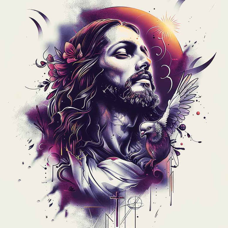 An AI-generated tattoo project exploring a Christ-inspired portrait rendered in a bold black and grey watercolor style, with a rich purple halo. The piece fuses classical reverence with contemporary ink techniques to create a wearable tribute that feels both timeless and modern. The central figure is framed by a luminous halo that radiates into irregular splashes of purple and graphite, suggesting divine light breaking through earthly shadow. The portrait is executed in fine line detailing for facial features, hair, and drapery, while the surrounding color washes give movement and atmosphere without overpowering the subject. The painterly background blends controlled ink density with splatter accents to evoke the energy of sacred art and street-inspired tattoo aesthetics. The design leans into symbolic meaning: the halo signifies holiness and kingship, the purple hues connote royalty and sacrifice, and the subtle feathered or wing-like motifs allude to angels’ presence and guardianship. The composition is scalable from a small forearm piece to a larger back canvas; its high-contrast black and grey foundation ensures longevity on the skin, while selective purple accents provide a focal point that draws the eye. The tattoo design embraces both realism in portraiture and the expressive flair of watercolor, making it suitable for those seeking meaningful tattoos that honor faith and personal narrative. This project is clearly a cover-up-friendly concept: the bold shading and dynamic negative space can be used to conceal prior work beneath, while the halo and encircling light can help create a unified new image. AI-generated by InkBy.Ai demonstrates how digital ideation can translate into a custom tattoo design that respects tradition while embracing contemporary body art. Keywords: tattoo, tattoo design, meaningful tattoos, fine line tattoo, lotus flower tattoo, infinity tattoo, tribal tattoo, rose tattoo design, small tattoos, flower tattoos, custom tattoo design, Japanese style tattoo, black and grey, realistic tattoo, body art, ink.