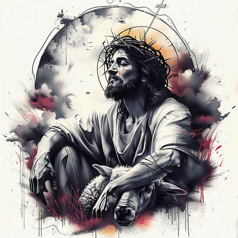 This AI-generated tattoo project centers a lifelike Jesus portrait rendered in black and grey, where chiaroscuro modeling brings the features to life—the gaze thoughtful, the beard and robe rendered with careful soft shading that invites the eye to linger. Behind the figure sits a circular mandala, a sacred geometry halo that expands the image into a symbolic orbit, representing eternity, unity, and divine protection. A restrained wash of red threads through the lower mass of fabric and background, evoking sacrifice and the living presence of faith without overwhelming the composition. The piece balances realism with painterly texture; subtle splatters and smoke-like gradations keep the background dynamic while preserving the sanctity of the central figure. The result is a strongly connected tattoo design that doubles as a meaningful symbol for devotion, sacrifice, and mercy. Because of its dense dark areas and negative space, it also doubles as an excellent cover-up solution for older work, allowing new lines to overlay or replace faded ink with significant impact. Technique-wise, the artist blends refined line work for facial fidelity with smooth gradients and selective stippling on folds to convey fabric weight and age, creating a timeless, faith-filled image suitable for the chest, back, or sleeve concepts. Symbolically, the circle and mandala convey infinity and divine order, while the Christ figure embodies humility and service—an enduring testament that speaks to those seeking a sacred, personal connection through ink. This is a true example of an AI-generated tattoo project that merges traditional iconography with contemporary execution, inviting wearers to carry a meaningful reminder of grace, hope, and faith. The design remains versatile for both small and large formats, ensuring a powerful presence that honors tradition while embracing modern body art aesthetics. SEO keywords woven through this description include tattoo, tattoo design, meaningful tattoos, fine line tattoo, lotus flower tattoo, infinity tattoo, tribal tattoo, rose tattoo design, small tattoos, flower tattoos, custom tattoo design, Japanese style tattoo, black and grey, realistic tattoo, body art, ink.