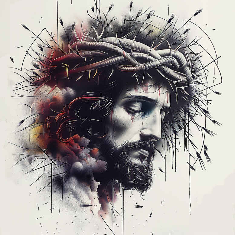 This AI-generated tattoo project presents a solemn Jesus crown of thorns portrait executed in moody black and grey watercolor. The composition centers on the lifelike face, framed by a rugged crown of thorns that encircles the brow, with strands of hair and a defined beard lending gravity and humanity to the sacred subject. The watercolor technique introduces fluid, bleeding edges and intentional splashes that merge the figure with a dark atmospheric backdrop, conveying both suffering and reverence. The design emphasizes tonal contrast and subtle shading to sculpt volume in the face, while the thorny crown creates a powerful focal point that anchors the symbolism of sacrifice, redemption, and steadfast faith. Elements such as the crown of thorns, the eyes and expression, hair, and beard work together to create a contemplative portrait suitable for a bold, cover-up tattoo that can conceal previous ink while preserving the sacred message. As a concept, this piece functions well as a custom tattoo design for believers seeking a meaningful representation of Jesus that can adapt to larger canvases or more intimate placements. The technique blends fine line precision with painterly washes to achieve a modern yet reverent feel, while the black and grey palette keeps the image timeless and versatile across skin tones. Subtle red accents may be introduced in alternate iterations to hint at the life and sacrifice expressed in the scene, without overpowering the solemn mood. For cover-up purposes, the dense shading and strong silhouette provide ample latitude for masking older tattoos, enabling a seamless transformation that respects tradition while embracing contemporary aesthetics. This narrative-forward portrait aligns with trends in fine line and realistic religious tattoo studies, and the AI-generated approach offers a fresh, interpretable take on a classic iconography, suitable for both single-visit sessions and extended sessions that refine detail and texture. In the end, the tattoo remains a potent reminder of perseverance, salvation, and faith, and it invites dialogue about the relationship between suffering and grace in the context of body art. Keywords include tattoo, tattoo design, meaningful tattoos, fine line tattoo, crown of thorns, religious tattoo, black and grey, portrait, sacred art, and custom tattoo design, ensuring visibility in search and inspiration for future projects.