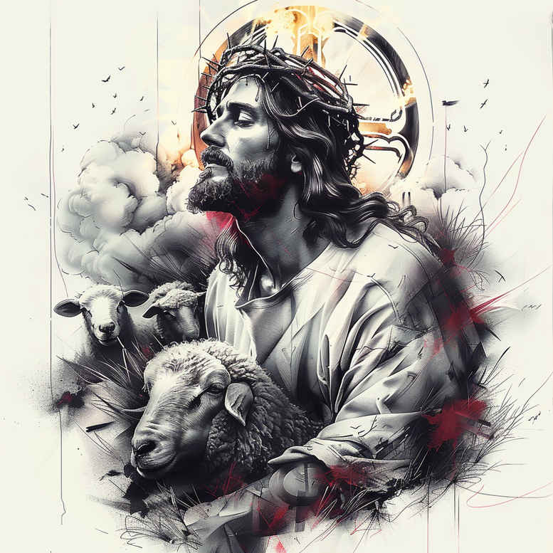 AI-generated tattoo project presents a reverent scene: Jesus, crowned with thorns, cradling a lamb as a living symbol of mercy and sacrifice. The composition rests in grayscale and is rendered with painterly washes that mimic charcoal and soft ink, with a halo circling the savior’s head to emphasize divine radiance. The robe drapes with careful folds, while clouds swirl in the background to create a celestial atmosphere and a sense of depth that invites closer inspection. The central figure anchors the design while subtle crimson accents, like a restrained bleed, evoke the passion without overwhelming the image, making this piece powerful yet restrained. This tattoo design speaks to the Agnus Dei tradition—the Lamb of God—where sacrifice and redemption are intertwined. The lamb lies calmly in Jesus’ grasp, symbolizing innocence and protection, while the crown of thorns underscores suffering endured for humanity’s salvation. The technique blends fine line details with broad, soft shading to achieve a contemporary black-and-grey aesthetic that works well on larger canvases or as a dramatic shoulder, chest, or back piece. In terms of technique, expect delicate linework around the lamb and halo, with deliberate contrast between the bright highlights and the deep shadows to create a sculptural form. The grayscale palette reinforces timeless sacredness and ensures the tattoo ages gracefully, with bold blacks that anchor the composition and fine-line textures that invite a closer look. As an AI-generated tattoo project, the image explores a classic religious iconography through a modern lens, marrying traditional symbolism with a current complexion of ink. Its heavy ink density and thoughtful negative space also make it an ideal candidate for cover-up work, allowing darker existing ink to be masked while preserving the spiritual narrative. For collectors seeking meaningful tattoos, this piece embodies devotion, sacrifice, and mercy, while remaining adaptable to various placements. The piece keeps exploring concepts such as sacred geometry via halo and cloud motifs, even as the focal point remains the intimate encounter between Christ and the Lamb. A refined black-and-grey design, it can be scaled for a refined small tattoo or expanded into a larger, statement piece, always maintaining legibility of the key symbols and their message of redemption and faith. tattoo design keywords: meaningful tattoos, fine line tattoo, custom tattoo design, black and grey, ink, body art.