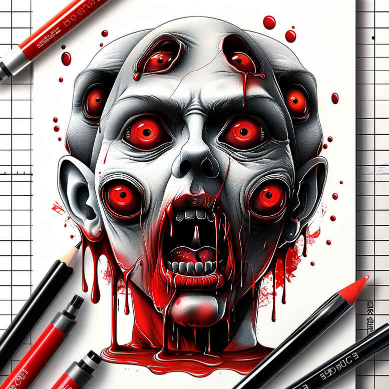This AI-generated tattoo project concept presents a dark, graphic zombie head rendered in black and grey with strategic touches of red. The central image is a skeletal, snarling visage whose crimson eyes draw immediate attention, while drips of blood accent the macabre mood. The design emphasizes high-contrast shading, fine line detailing for texture in the skull, lips, and teeth, and careful gradient work to achieve a three-dimensional look on skin. Crafted as a cover-up solution for worn or dark-edged areas, the piece uses a bold silhouette and dense negative space that adapts across canvases from small to large. Surrounding elements in the render are minimal, including markers and a grid backdrop that signal a studio-origin, making it straightforward to transfer to skin during the tattoo process. Symbolically, the zombie figure can symbolize resilience and transformation through hardship, while the many eyes imply vigilance and a sharpened perspective on personal journeys. The color palette centers on black ink with vivid red accents to heighten drama, aligning with black and grey realism while preserving readability when filtered to smaller sizes. The concept fits squarely within tattoo design and body art discourse, with potential for meaningful tattoos that pair with phrases like fine line tattoo or realistic tattoo aesthetics. As a AI-generated tattoo project concept, it offers a tangible starting point for custom tattoo design discussions, illustrating how dark, pattern-rich imagery can be shaped into a cover-up-ready centerpiece or extended into a larger composition, including Japanese-style, tribal, or floral motifs if desired. Clients can explore options for line weight, shading techniques such as stippling and cross-hatching, and scale to ensure the piece remains legible and impactful as ink.