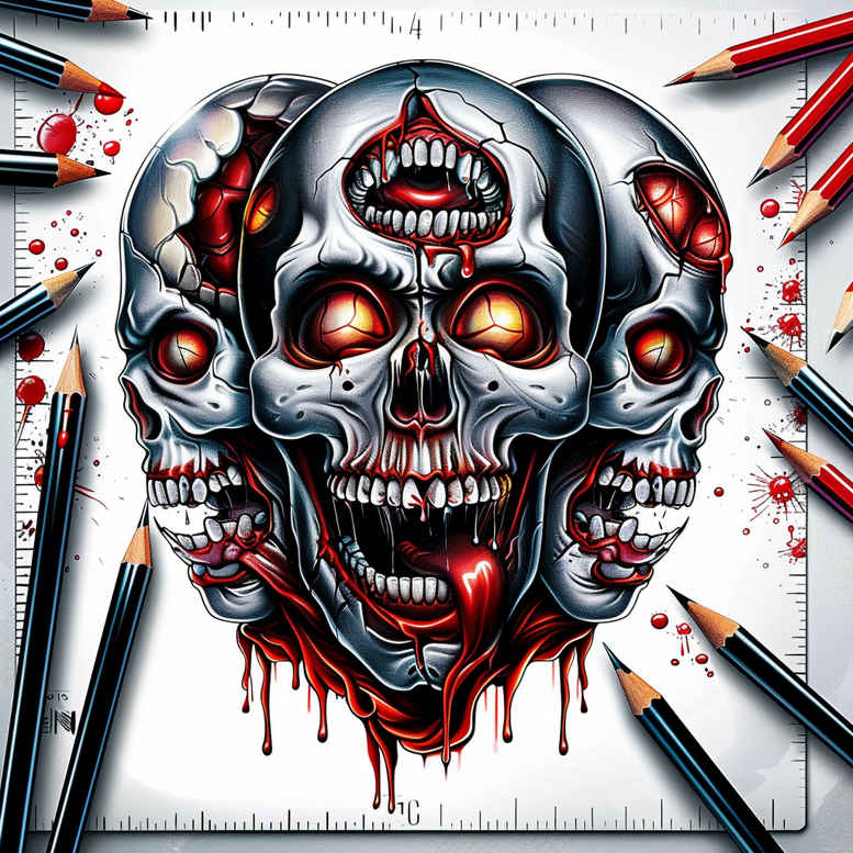 Presented as an AI-generated tattoo project, this dark, high-contrast study centers on a triple skull motif formed by interwoven planes and graphic patternwork. Executed in black and grey with careful shading, it relies on negative space and crisp linework to achieve depth, while red accents animate the eye sockets and mouth for visceral impact. The central skull seems to spawn two companions, a visual metaphor for memory, transformation, and the cycles of life—ideas that resonate with meaningful tattoos and custom tattoo design. The surrounding layout echoes an artist’s bench: pencils and tool silhouettes frame the composition, reinforcing its function as a practical cover-up solution for concealing older work beneath a dominant new image. The pattern-rich surfaces provide strong graphic readability at various scales, making it suitable for forearm, chest, or back placements while preserving clarity on skin tones. Symbolically, the trio of skulls can imply past, present, and future, while the restrained red gives a life-force counterpoint to the cool monochrome. The piece blends influences from Japanese style tattoo and tribal tattoo languages through its structured geometry and layered shading, yet it remains anchored in a realistic tattoo ethos—black and grey realism that suits both small tattoos and larger body art explorations. For clients seeking a robust cover-up, the dense shadings and overlapping planes offer ample concealment of prior ink, while still presenting a striking, intricate tattoo design that works as a standalone piece or a lead-in to a larger sleeve. This project illustrates how AI-generated concepts translate into tangible ink possibilities, bridging digital and traditional approaches with professional polish, and it sits comfortably within the broader discourse of ink, tattoo design, and meaningful tattoos.