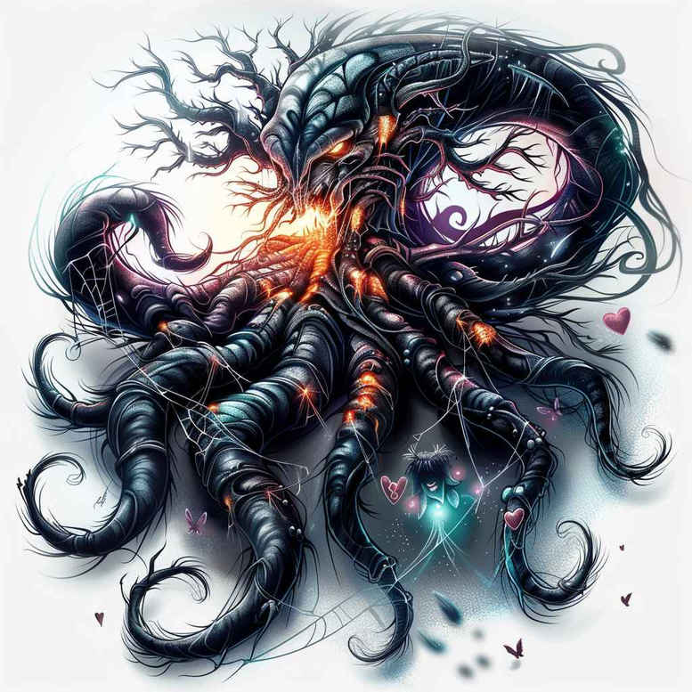 AI-generated tattoo project concept presenting a dark, tentacled creature rendered in black and grey with a vivid orange core. The composition centers on a mythic, sinewy figure whose labyrinthine limbs spiral outward, forming an intricate, graphic pattern that lends itself to a large-scale sleeve or back piece. Fine line work defines the many tentacles with crisp, feathered edges, while broader shading builds volume in the central body and suction-like sections, creating a convincing sense of depth. The orange core glow acts as a luminous counterpoint, drawing the eye to the heart of the design and providing a focal anchor for transitions across skin tone. This juxtaposition of delicate line work and saturated shadow gives the tattoo both dynamism and a timeless, nearly sculptural feel. Symbolically, the creature can represent transformation, resilience, and the power to navigate darkness, making it a meaningful tattoo for someone seeking personal narrative within an arresting image. Because the image is remarkably dark, it is particularly well-suited as a cover-up, with the dense black ink offering substantial masking capability and the surrounding tentacles providing multiple pathways to blend or layer with existing marks. The graphic, interwoven tentacles also allow for flexible placement—from shoulder to thigh—while accommodating adjustments to scale and density. In terms of technique, the design blends realistic shading with select Japanese-influenced curves to achieve a naturalistic yet stylized look, but it remains adaptable to other genres such as tribal or neo-traditional tattoos. As an AI-generated tattoo project concept, it invites customization: the creature’s size, the tentacle arrangement, and the glow intensity can be tailored to fit anatomy, skin complexion, and personal symbolism. For discoverability, the description includes terms such as tattoo, tattoo design, meaningful tattoos, fine line tattoo, lotus flower tattoo, infinity tattoo, tribal tattoo, rose tattoo design, small tattoos, flower tattoos, custom tattoo design, Japanese style tattoo, black and grey, realistic tattoo, body art, ink, with explicit notes on cover-up suitability and pattern elements.