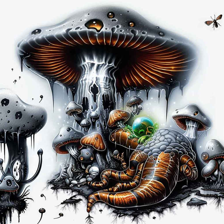 AI-generated tattoo project presents a nocturnal mushroom morph set against a brooding, near-black background. The dominant element is a towering mushroom with a wide cap and a sinewy stalk, surrounded by smaller mushrooms and creeping fungal textures that dissolve into a shadow-rich ground. The composition relies on graphic patterns formed by spotted caps, gill lines, and stippled shading to create a dense, almost textile surface that remains legible in a tattoo. The treatment uses black and grey ink with careful gradation, balancing strong silhouettes with subtle mid-tones to achieve depth without losing detail at skin scale. The piece reads as a surreal natural study, invoking metamorphosis and resilience, where nature’s cycles are rendered as ink and shadow. The design nods to Japanese style tattoo influence through restrained line quality and a structured flow, while the crowded, interwoven forms carry a modern, abstract edge that suits small tattoos or larger back pieces—though offered here as a cover-up concept. For clients seeking a conversion from existing marks, the denser shading and natural motifs provide an effective canvas for cover-up, allowing old lines to be masked by new, cohesive forms. In terms of meaning, mushrooms symbolize renewal and interconnectedness within dense networks, while the dark foreground evokes introspection, making this concept a meaningful tattoo choice for those drawn to nature-inspired ink. The image invites interpretation and customization: scale, placement, and motif emphasis can shift toward a singular focal mushroom or a broader cluster. Keywords to consider include tattoo, tattoo design, meaningful tattoos, fine line tattoo, lotus flower tattoo, infinity tattoo, tribal tattoo, rose tattoo design, small tattoos, flower tattoos, custom tattoo design, Japanese style tattoo, black and grey, realistic tattoo, body art, ink. As an AI-generated tattoo project, it is particularly well-suited for a cover-up scenario given its heavy shading, layered textures, and capacity to overwrite existing markings with a unified, legible image.