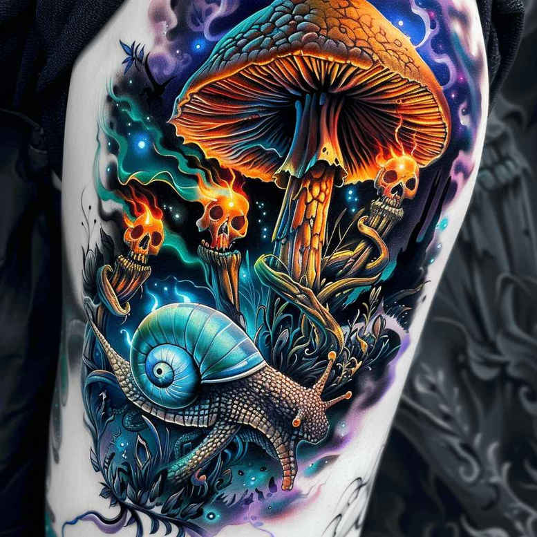 AI-generated tattoo project concept rendered in vibrant neon hues, this design presents a surreal forest-scape built around a bright orange mushroom and cobalt snail. The composition unfolds with twisting vines, verdant leaves, and small floral accents that weave between the subjects, creating a dynamic narrative suitable for a large-scale arm or leg piece. Executed in a blend of bold outlines and saturated color, the artwork nods to neo-traditional and Japanese-inspired tattoo aesthetics while remaining adaptable to realistic shading and black-and-grey tints if desired. The mushroom, rendered with ribbed gill detail and a warm gradient cap, anchors the scene; the blue snail provides a contrasting cool counterpoint with shell textures and a subtle iridescence. Surrounding flora adds rhythm and movement, while negative space and delicate shading give depth and a sense of light catching on the surface. Techniques include precise color blends, fine line accents for filigree-like highlights, and disciplined contour work to define edges without overpowering the luminous palette. Symbolically, mushrooms can signify growth and transformation, while snails convey patience and persistence; together, they evoke a personal journey and a sense of wonder. The design is conceived to scale gracefully for sleeves or back pieces, yet remains legible in smaller forms, with planning for line weights and color blocking that preserve clarity on skin texture. As an AI-generated tattoo project, it showcases contemporary ink trends and the potential for a custom tattoo design that blends nature motifs with a bold, narrative frame.
