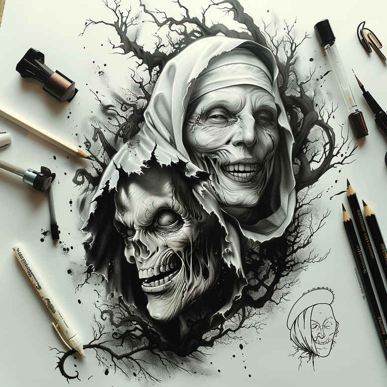 An AI-generated tattoo project presenting a grayscale portrait that fuses life and death through a skull and an elderly woman’s visage, both rendered with careful shading and subtle line work to achieve a realistic black and grey aesthetic. The composition centers on a skull partially interwoven with a compassionate older face, framed by a hood that blends into a textured, paper-like background. Pencil outlines and the sketch’s graphite texture are visible, signaling this as a design concept prepared for ink transfer. Symbolism anchors the piece in mortality and memory: the skull embodies impermanence, while the woman’s expression evokes experience, wisdom, and resilience. The pairing creates a stark dialogue between decay and continuity, suitable for a bold tattoo design on the forearm, shoulder, or back. The technique emphasizes contrasts, soft gradients, and precise detailing that suit both fine line tattoo and more traditional black and grey realism, with room to adjust line thickness for a client’s preferred difficulty level. This cover-up-ready concept is especially appealing for covering an older, darker tattoo, thanks to its dense shading and strong negative space around the central figures. As a piece of modern body art, it demonstrates how a two-figure narrative can convey personal meaning—identity, memory, and mortality—without relying on color, relying instead on ink density, texture, and composition. The main elements—skull, woman, hood, pencil, paper—provide a flexible foundation for customization; the image remains suitable for a standalone tattoo design or as a template for Japanese style tattoo motifs, tribal hints, or floral accents should the client request them. This AI-generated tattoo project showcases how design concepts can translate into a compelling tattoo design, meaningful tattoos, and a distinctive black and grey piece that resonates with ink lovers and collectors of small tattoos while remaining adaptable to larger body art canvases. The approach emphasizes professional execution, meticulous line control, and atmospheric shading that elevates a simple sketch into a narrative-driven body art concept, perfect for clients seeking meaningful tattoos that carry a personal story and a timeless monochrome aesthetic.