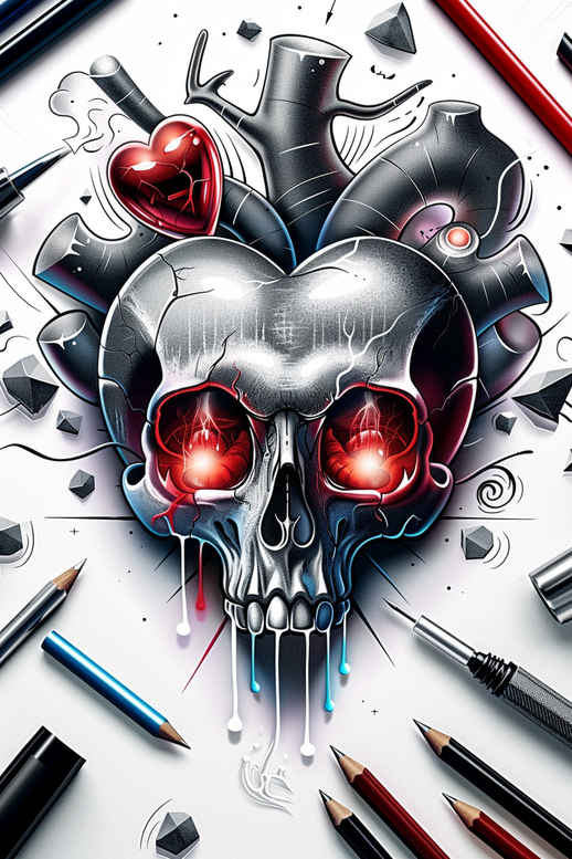 AI-generated tattoo project presenting a bold black and grey skull rendered with realistic shading and high-contrast linework. The central motif is a menacing skull whose facets catch light as if sculpted in metal, with eerie red eye sockets that draw the viewer’s gaze and a vivid red heart resting on the forehead to add unexpected symbolism. A scatter of colored pencils—blue, red, yellow, and graphite—hints at the intersection of creativity and danger, framing the skull and giving the composition a dynamic, almost cinematic energy. The design relies on dense blacks, smooth grey gradients, and crisp outlines to achieve a three-dimensional effect that reads clearly on skin from a distance, yet rewards close inspection with subtle textures and tonal shifts. Because the piece uses a dark foundation, it is particularly well suited as a cover-up tattoo, where the negative space and solid silhouettes can mask existing ink while delivering a powerful silhouette. The concept blends realism with graphic illustration, making it adaptable for larger canvases such as back or sleeve work or compact on the forearm with careful scaling. Symbolically, the skull conveys mortality and resilience, while the heart introduces a counterpoint of love or passion; the pencils can symbolize craft, study, or the artist’s tools, turning the image into a narrative of creation under pressure. In terms of technique, you could translate this concept into Japanese-style tattoo influences or integrate rose or lotus motifs for further meaning, and it easily accommodates a full black and grey palette or selective red accents for emphasis. This is an AI-generated tattoo project, illustrating how digital concepts can seed impactful ink ideas; when inked with careful shading and line control, the resulting tattoo design can be both striking and meaningful. Given its bold dark values and strong silhouette, the piece is a prime candidate for a cover-up, offering a dramatic, enduring body art statement that can be customized to fit individual anatomy and skin tone and scaled to the patient’s preferred placement.