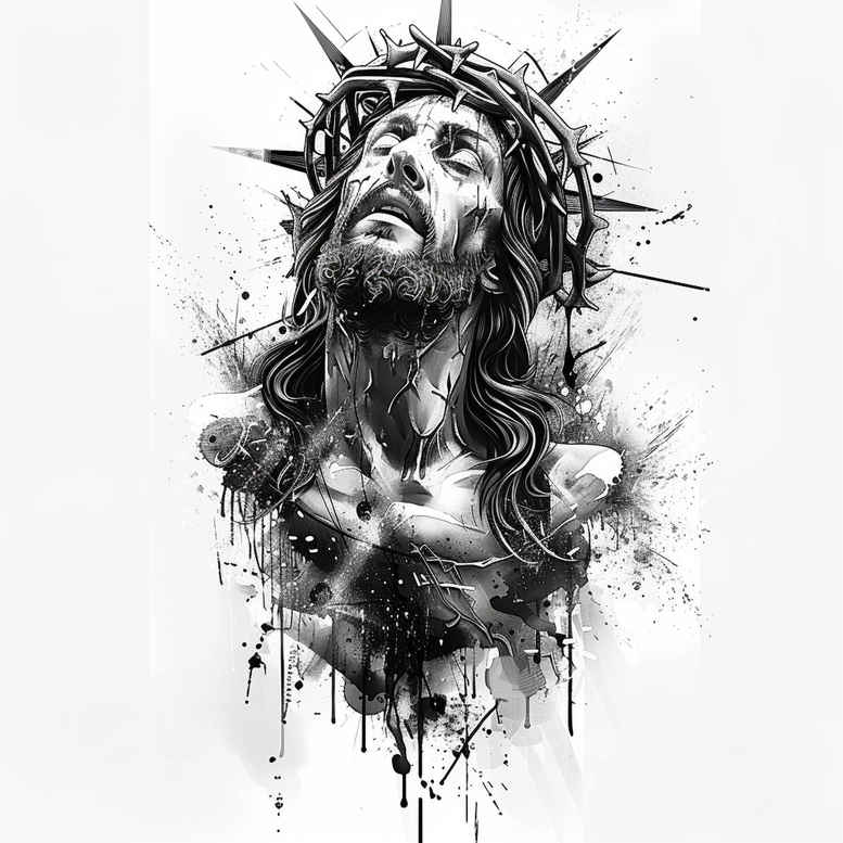 An AI-generated concept rendered in black and grey, this Jesus crown of thorns portrait sits at the intersection of devotion and modern body art. The focal point is a lifelike bust of Christ, rendered with restrained shading to convey calm interior light and the weight of suffering, while a harsh crown of thorns encircles the head as a stark emblem of sacrifice. Ink splatters and trailing drips frame the figure, imparting motion and emotional gravity and blending traditional sacred imagery with contemporary tattoo aesthetics. The grayscale palette emphasizes form, texture, and atmosphere, inviting the viewer to contemplate faith through light, shadow, and negative space. This approach yields a painterly, almost charcoal vibe while retaining crisp edge work that holds up on large canvases such as the back or chest; the splatter motif also signals a modern, dynamic energy that keeps the design from feeling static. Because the design is very dark, it doubles as a cover-up concept, offering dense blacks and bold silhouette to obscure prior work while preserving a powerful religious narrative centered on Jesus, sacrifice, forgiveness, and resilience. In terms of technique, expect smooth transitions in shading around the face, a strong emphasis on the crown’s jagged ring, and deliberate ink splashes that create texture without overwhelming the central figure. The meaning behind the crown of thorns anchors the portrayal in sacrifice; Jesus embodies mercy and endurance, and the ink’s gravity suggests unwavering faith in the face of darkness. For collectors seeking a meaningful tattoo design with impact, this concept embodies a custom tattoo design in black and grey realism, capable of translating across placements and sizes, from small to large. As an AI-generated tattoo project, it illustrates how algorithmic tools can augment traditional sacred imagery while remaining faithful to its symbolism; it remains relevant to keywords such as tattoo, tattoo design, meaningful tattoos, black and grey, realistic tattoo, body art, and crown of thorns as a timeless motif.