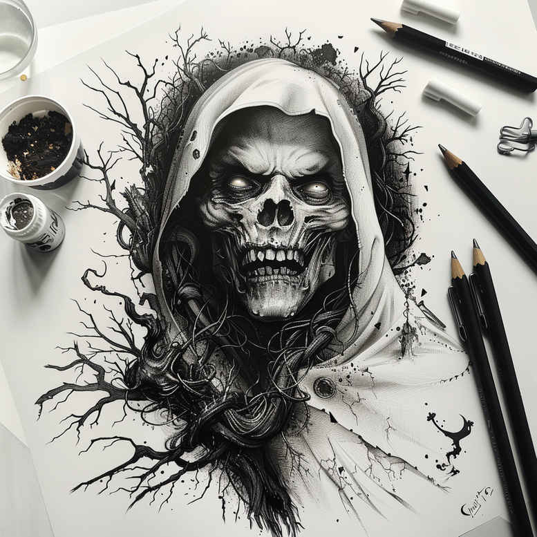 This piece is a bold, high-contrast concept in black and grey that centers a skull enshrouded by a hood, with gnarly tree branches weaving around the face and fabric. The composition masters negative space and dense line work to create a silhouette that reads clearly at various sizes, a crucial consideration for a cover-up tattoo project. The hood frames the skull like a nocturnal cathedral, while the branches branch out across the chest or back, offering natural masking opportunities for existing ink while maintaining dramatic impact. The rendering leans toward realism in shading and anatomy, yet preserves a graphic quality through crisp outlines and deliberate branching patterns that evoke branches, roots, and wind-swept texture. The overall mood is somber yet serene, symbolizing mortality, resilience, and the persistence of life as it threads through dark times. This is not mere ornament; the design is meant to carry meaning for the wearer, aligning with themes common in meaningful tattoos such as mortality, protection, and transformation. While the concept is bold, the fine line approach allows subtle gradations of gray for depth and form; the black and grey palette ensures the piece remains legible on skin and ages with time. For tattoo enthusiasts seeking small tattoos or larger panels, this design scales well from a discreet forearm piece to a full-back statement, and its cover-up capability makes it a strong candidate for concealing prior work. The imagery also nods to styles across cultures: the Japanese influence in control of line flow, the tribal tactility of intertwining lines, and the classic Western skull motif, all harmonized into a cohesive modern tattoo design. Its minimal color interpretation makes it an ideal inspiration for a custom tattoo design that remains timeless, while still offering room for personalization and adaptation by an artist. This AI-generated tattoo project concept showcases how AI can assist in visualizing a sophisticated, symbolic composition that stays true to tattoo conventions, body art readability, and the demands of real-world inking. In practice, a skilled tattooist would adapt the branch density, line weight, and shading to the client’s anatomy and skin tone, preserving the piece’s intended readability and impact across ages and wear.