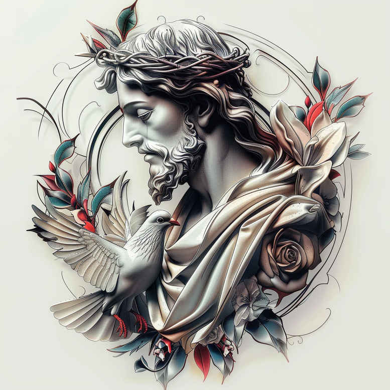 An evocative, color-rich Jesus portrait tattoo design that fuses sacred symbolism with natural elements in a compact, circular composition. The central figure, Jesus, emerges in a lifelike, reverent profile crowned by thorns, with careful skin tones and soft shading that give him presence without harsh caricature. Two doves drift near the crown, their pearled highlights and light edges signaling the Holy Spirit and peace, while a wreath of roses curls around the head and shoulders as symbols of mercy, sacrifice, and eternal love. Leaves and fabric folds frame the scene, guiding the eye along curved lines that create a nearly mandala-like rhythm, making the piece feel cohesive on a shoulder, bicep, or chest panel. The color palette leans toward warm skin tones, earthy neutrals, crimson accents on the roses, and subtle blue tints in the dove feathers, balancing realism with painterly atmosphere so the design remains legible when scaled down to fine-line tattoo sizes or expanded for broader sizes. Technique-wise the artist emphasizes fine-line outlines, crisp edgework, and smooth gradient transitions between light and shadow, with deliberate layering to maintain clarity over time; the result is a versatile tattoo design that reads well in full color or black and grey, depending on ink choices, and which can host additional script or emblems for personal meaning. Symbolically, the image speaks of sacrifice and grace, the thorn crown a reminder of Christ’s passion, the doves of divine presence, and the roses of mercy and love that endure beyond suffering. These are AI-generated tattoo projects, so the concept aims to test balance, readability, and harmony across skin tones and placements, ensuring the composition remains striking yet refined as a fine line tattoo or a larger color piece. For wearers seeking a spiritually resonant, artfully crafted tattoo design that blends faith with modern body art, this concept offers a compelling option, inviting introspection with every glance and serving as a lasting homage to Jesus Christ.