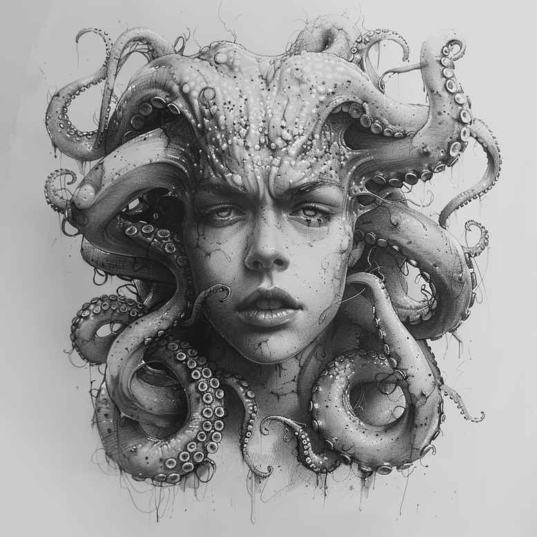 Presented as an AI-generated tattoo project, this Medusa portrait is rendered in black and grey with meticulous linework and shading that captures the serpentine coils around the head. The central figure is Medusa’s face, framed by a cascade of snakes that curl in rhythmic patterns, conveying motion and tension while a soft gradient builds three-dimensional form. The study emphasizes fine line detailing for the scales, subtle stippling on the skin, and controlled contrast to achieve depth on larger canvases or compact placements. Visible elements include the Medusa head and several serpents, weaving across the grayscale composition, suitable as a standalone piece or a base for larger body art. Symbolically, Medusa represents power, protection, and transformation; the snakes evoke renewal and danger, while the gaze adds piercing intensity. This tattoo design is adaptable to a realistic black and grey aesthetic and can be adjusted for small tats or expansive back pieces; its legibility through bold line work makes it versatile for forearms, shoulders, or chests. For meaningful tattoos, the Medusa with snakes offers a dramatic centerpiece with potential for Japanese-inspired shading or a more traditional mythic approach as a custom tattoo design. As an AI-generated tattoo project, it demonstrates how digital drafting can aid tattoo artists in refining line density, symmetry, and pattern continuity across the serpents. The overall darkness and contrast render it an excellent candidate for cover-up applications, capable of masking existing ink while preserving striking visual impact. The serpents’ scales and looping forms create a cohesive pattern that flows with body contours, underscoring the design’s bold rhythm and making it suitable for a wide range of tattoo styles from fine line to realistic, black and grey body art.