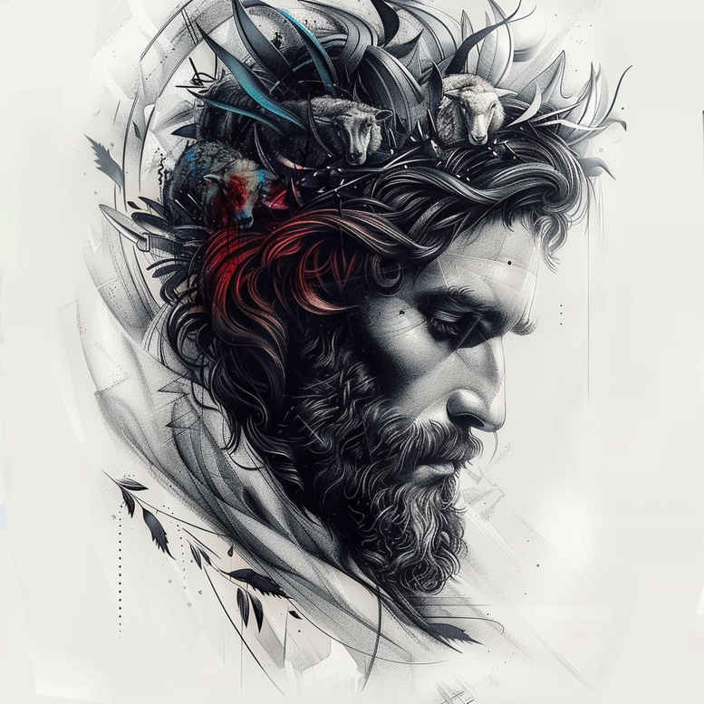 This AI-generated tattoo project presents a contemplative portrait of Jesus, rendered in black and grey with an intricate crown of thorns crafted from intertwining branches. The image centers on a dignified profile: strong brow, thoughtful eye, and a full beard, framed by hair that dissolves into thorny wisps as if the scene emerges from a living, sacred pattern. The crown—woven from branches and thorn—acts as both ornament and symbol, signaling sacrifice, redemption, and steadfast faith. The design uses delicate fine-line work and controlled shading to create depth without overwhelming contrast, suited for a sober, timeless look on the skin. The interplay between negative space and dense ink invites the eye to follow the contours of the face, while the thorny crown anchors the composition in mythic Christian symbolism. This piece embraces a modern tattoo design aesthetic while preserving traditional iconography, making it a meaningful tattoo choice for those seeking a powerful narrative body art. The low-contrast palette ensures a versatile option for long-term wear and a discreet yet striking result, and its patterning makes it especially compelling as a cover-up piece for existing ink. As an AI-generated tattoo project, it demonstrates how digital planning can translate sacred imagery into precise line-work, blending classic biblical symbolism with contemporary tattoo techniques. Keywords such as tattoo, tattoo design, meaningful tattoos, fine line tattoo, black and grey, realistic tattoo, and custom tattoo design flow naturally here, while terms like Japanese style tattoo, tribal tattoo, rose tattoo design, lotus flower tattoo, infinity tattoo, flower tattoos, small tattoos, and ink surface as tangential inspirations that inform the composition. The design’s meaning remains constant: reverence for Jesus and the sacrifice signified by the crown of thorns, a timeless reminder etched in ink.
