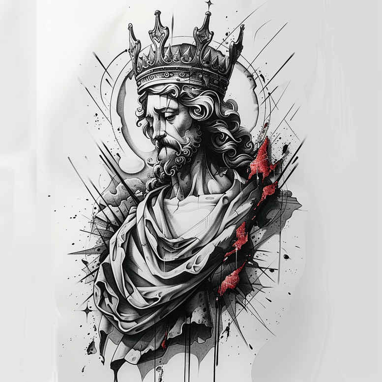 As an AI-generated tattoo project, this Jesus portrait centers on a crowned Christ rendered in black and gray with fine line contouring and a halo that glows through delicate wisps. The composition thrives on a graphic pattern of linear bursts and ink splatter that frames the sacred figure while preserving readability, a hallmark of contemporary sacred art. The crown is intricate, with subtle highlights that catch the light, and the face carries restrained shading to convey calm resolve and compassion. Red accents along the drapery introduce a focal warmth, drawing attention to symbolic sparks of love, sacrifice, and mercy without overshadowing the grayscale harmony. Symbolically, the image speaks to kingship, redemption, and eternal blessing, inviting the wearer to carry a reminder of divine authority and grace. The piece blends a fine line tattoo ethos with controlled shading to offer depth, making it adaptable for large canvases such as the chest, back, or sleeve, or suitable as a refined study for smaller areas. The approach embraces a modern pattern language—splatter, bursts, and radiating lines—creating a dynamic yet reverent aesthetic that remains legible over time in black and grey. This concept showcases how sacred imagery can be reimagined as body art while retaining timeless meaning. AI-generated tattoo projects remind us of the evolving nature of ink, and this design specifically uses dark contrasts and pattern elements to convey a bold, contemplative message. Given the heavy shading and dense pattern, the project is also presented as an excellent option for a cover-up.