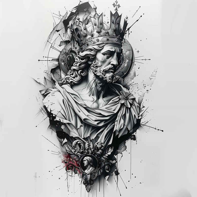 An AI-generated tattoo project that centers on a solemn, reverent portrait of Christ. This very dark, black-and-grey study presents a classical bust of Jesus wearing a crown of thorns, draped in a ceremonial robe, with ink-splashed flourishes that ripple outward like shattered glass. The design reads as a contemporary fine-line study, where razor-thin lines define the contours of the features while soft gradients render the skin, hair, and fabric with quiet dignity. The crown of thorns encircles the brow in jagged detail, a visual paradox that embodies both suffering and sovereignty, honoring our greatest King, Jesus Christ. The bust anchors the composition, offering a timeless focal point that invites contemplation, while the surrounding abstract elements and splatters evoke the mystery of faith and the power of the gospel. The piece uses controlled black ink, crisp cross-hatching, and subtle stippling to build depth without losing the solemn personality of the figure. The pattern-like fragments—geometric shards and irregular speckles—bring a modern edge to a sacred subject, making this tattoo design suitable for a bold chest, back, or sleeve while retaining reverence. For collectors who value meaning, the symbolism is explicit: humility in the robe, kingship in the crown, sacrifice in the thorn, and redemption in the shared space between light and shade. The composition intentionally leans into a dark foundation, which, while dramatic, remains legible and gracefully adaptable to various placements and sizes; it is, in every sense, a cover-up ready tattoo project if placed to leverage existing ink or darker skin tones. As an AI-generated tattoo project, it serves as a test case for composition, line precision, and texture, balancing a classic religious icon with contemporary graphic language, and it can be refined into a custom tattoo design that respects tradition while embracing modern body art trends. In the broader market of tattoo work, this piece is a meaningful tattoo for believers and art lovers alike; it aligns with the global vocabulary of religious iconography, black-and-grey realism, and the enduring appeal of fine-line tattoo, while seamlessly integrating with phrases common in traditional and Japanese-inspired tattoo styles, providing keywords that support discovery in portfolios and catalogs and inviting a broader conversation about faith, art, and ink.