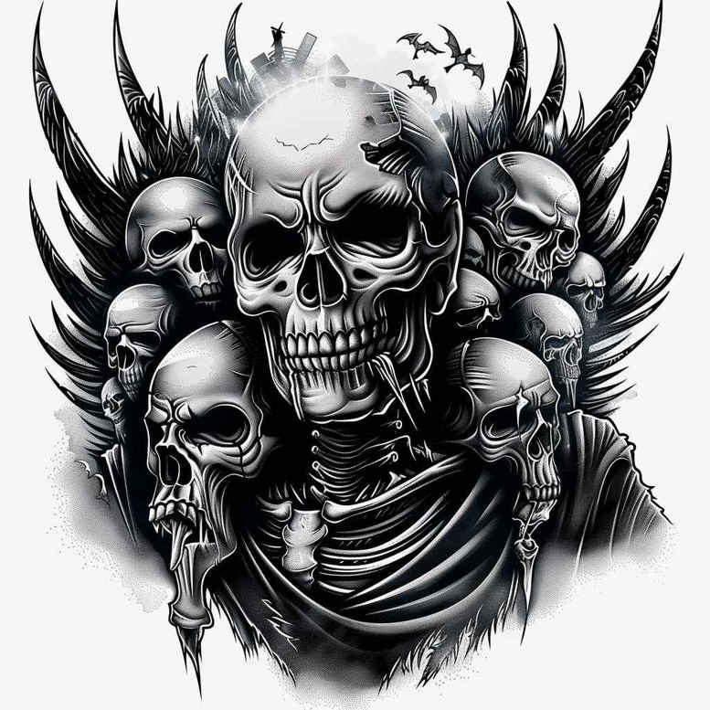 This is an AI-generated tattoo project concept that presents a moody, high-contrast skull wreath rendered in black and grey realism. The composition centers on a dominant skull, flanked by curling wings, and interwoven with draped fabric to create a continuous, protective frame around the centerpiece. Additional skulls nestle into corners, while gnarled shading and crisp linework define the edges, producing a tactile, skin-ready texture. The grayscale palette relies on deep blacks, mid-tones, and delicate highlights to achieve lifelike form and a timeless feel suitable for large placements. Symbolically, skull imagery evokes mortality and memory; wings signify ascent and freedom; the drapery suggests mystery and the passage of time, making the piece resonate as a meaningful tattoo concept for those seeking a personal narrative. Though rooted in a classic dark tattoo aesthetic, the design is adaptable for a custom tattoo design, with scalable details that maintain legibility on different body areas, from back to chest or sleeve. The technique emphasizes smooth grayscale shading, controlled contrast, and bold outlines that remain durable over time. This concept also showcases AI-generated approaches in contemporary body art, offering a robust foundation that artists can refine and personalize. For cover-up purposes, the heavy dark fields and strong silhouettes help mask existing work while delivering a striking, cohesive image that preserves the subject’s dignity and impact. As a black and grey realism study, it complements other ink motifs such as roses, lotus, or symbolic emblems, and can be integrated into broader collections or stand alone as a powerful statement piece. The overall result is a significant tattoo idea in the evolving landscape of ink and body art, designed to endure as a timeless piece while accommodating individual adjustments by a skilled tattooist.