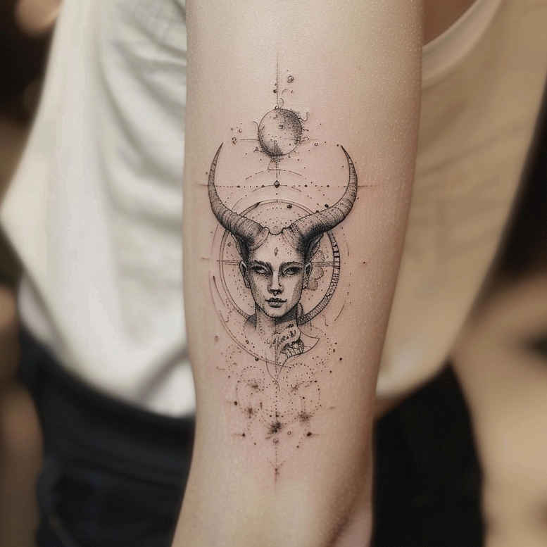 An AI-generated tattoo project concept presenting a dark horned face set within a circular ring. Rendered in black and grey linework, the design uses crisp outlines, restrained shading, and dotwork texture to create a compact focal point suited for the forearm. The central face carries horns that coil into a circular silhouette, producing a bold emblem with a slightly occult or mythic vibe. The ring behind the head acts as a halo, reinforcing the enigmatic character while leaving room for smoothing transitions into existing ink. Subtle splatter and pattern-like dotwork introduce movement without overpowering the main figure, giving the piece a graphic presence that also invites future layering if desired. Interpreted as a meaningful tattoo, the horned figure can symbolize protection, strength, or a personal totem, while the circular ring hints at cycles, renewal, and continuity. The design sits comfortably in the realm of fine line tattoo and black and grey tattoo, combining an illustrative aesthetic with the precision of line-work, making it adaptable for both small tattoos and larger sleeves if extended. It also pairs well with Japanese style tattoo influences or tribal tattoo motifs, offering a versatile base for a custom tattoo design that can be tailored to the wearer’s story. For clients seeking a classic yet contemporary tattoo, this piece delivers a strong silhouette with legible anatomy and scalable detail, suitable as a stand-alone piece or a cover-up solution for darker existing ink. While this concept is presented as an AI-generated tattoo project, its high-contrast forms and modular structure translate well to real-world tattoo practice, keeping ink density controlled and ensuring longevity on skin. If used as a cover-up, the dense black elements and careful tapering can mask previous tattoos effectively while preserving the dramatic figure’s impact; the result is a bold, ink-worthy tattoo design that remains faithful to traditional lines while embracing modern texture and pattern.
