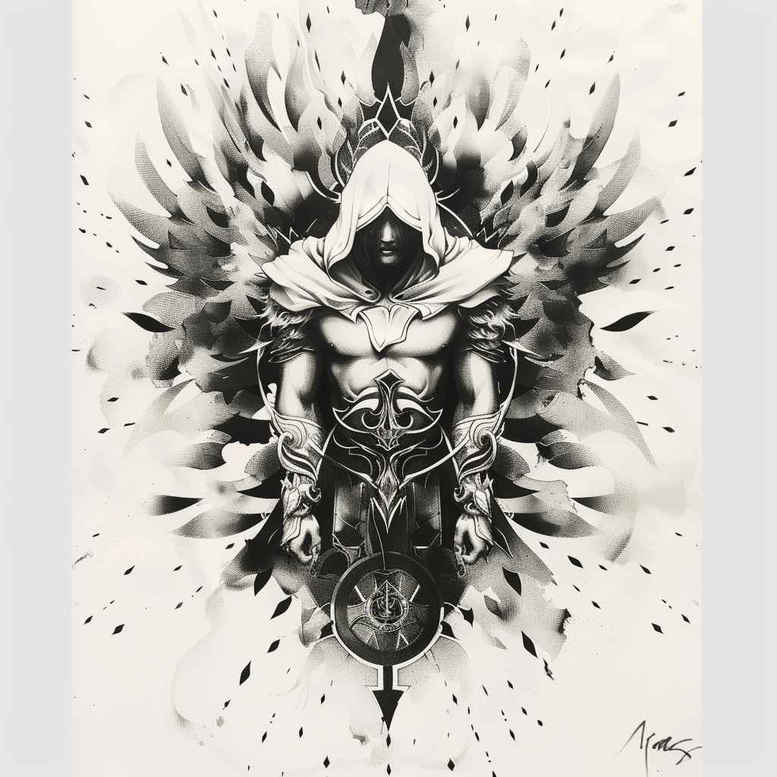 This AI-generated tattoo project presents a bold black and grey composition centered on a hooded figure wearing armor. An outward burst of ink and a controlled splatter pattern creates movement while leaving ample negative space for balance. Fine line work preserves legibility at small sizes, making this tattoo design versatile for compact placements or larger back or sleeve pieces. Symbolically, the hooded figure evokes mystery and inner resolve, while the armor suggests durability and discipline—a narrative of transformation and courage. The surrounding energy burst and geometric patterning add texture and rhythm, enhancing contrast between deep blacks and midtones without relying on color. The vertical symmetry invites placement on the chest, arm, or spine, with scalable details that remain clear as the piece grows. For a tattoo artist, the concept offers opportunities to weave in subtle Japanese influence, decorative linework, or a personal floral element to tailor the design; for the wearer, it provides a meaningful tattoo design—bold, enduring, and adaptable for small tattoos or larger body art. This project demonstrates how black and grey ink, precise line work, and graphic splatter can converge into a contemporary yet timeless tattoo design. As an AI-generated concept, it serves as inspiration for meaningful tattoos and custom tattoo design while highlighting a cover-up-friendly approach that can help obscure prior markings if desired. The work also doubles as a study in texture, where the hood’s fabric, the armor’s metal, and the splatter halo are rendered with careful shading, edge control, and layering so that a real tattoo artist can translate the idea with confidence.