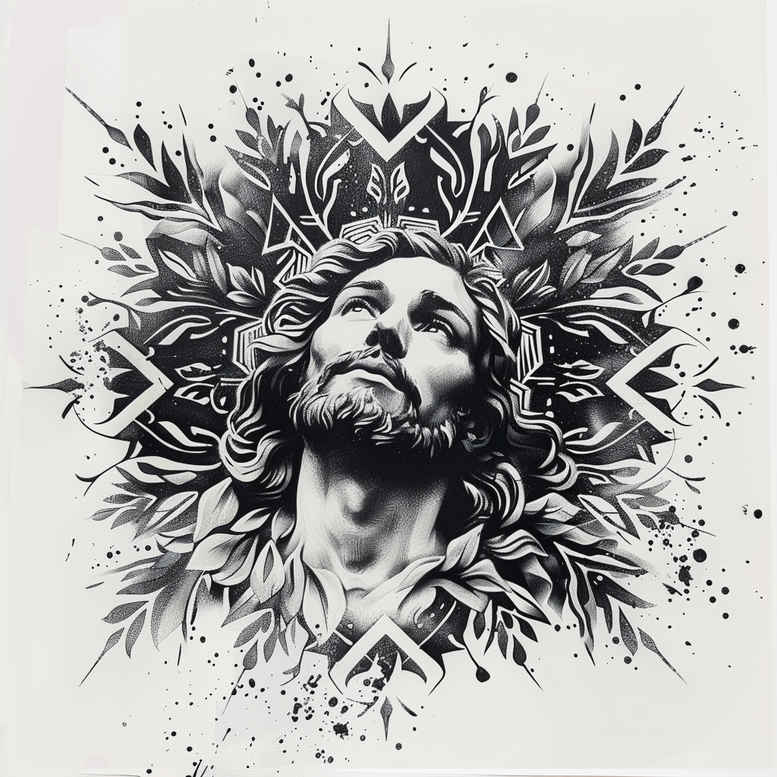 This AI-generated tattoo project presents a sacred icon rendered in black and grey, a timeless study of a sacred motif: the face of Jesus crowned by an organic halo of leaves. The central portrait shows Jesus’ head tilted skyward, gaze lifted, with a serene, patient expression that invites reflection. Surrounding him, a mandorla-like ring of stylized leaves unfolds into a radiant pattern of rays and geometric shards. The leaves symbolize renewal, life, and rebirth, while the luminous field around the head conveys divine illumination and guidance. The interplay of fine line contours and soft grey shading creates a lifelike depth without sacrificing clarity, making the design equally at home on the chest, back, or arm. The composition is dense and ornamental yet balanced, with negative space carved to emphasize the figure and the halo, improving legibility as a tattoo design over time. The patterned backdrop adds texture and energy, suggesting the presence of sacred light without overpowering the main subject. This piece speaks to meaningful tattoos that honor faith and memory, blending classical religious iconography with contemporary tattoo techniques: precise linework, flawless black and grey gradients, and a strong silhouette. For clients seeking a strong, contemplative statement, this design offers a powerful narrative of faith, resilience, and hope; it can be adapted to various sizes and placements while preserving its symbolic core. As a cover-up-friendly motif, its dense ink, bold contrasts, and intricate patterning allow it to mask previous work while leaving a dignified, serene new image. This is an AI-generated project that illustrates how modern tattoo artistry can translate sacred devotion into enduring body art, inviting the wearer to carry a personal message of Jesus into daily life.