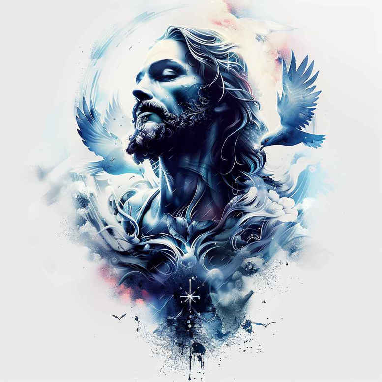 This AI-generated tattoo project presents a Jesus-inspired celestial portrait rendered in luminous blue watercolor tones, integrating sacred symbolism with a contemporary painterly aesthetic. The central figure is depicted with a calm, contemplative expression, a defined beard, and flowing robes, while a radiant halo crowns the head and soft, ethereal light emanates outward. Behind the figure, outstretched wings create a sense of guardianship and divine ascent, their feathered forms dissolving into airy washes that suggest movement rather than rigid line work. Scattered stars hover around the upper chest and shoulders, referenced as guiding lights on a spiritual journey, while the robe’s layered shading and translucent glazes lend depth and a subtle glow that captures the eye without overpowering the subject. The composition relies on the interplay of wet-on-wet and controlled detailing to achieve a luminous balance between softness and structure, a hallmark of watercolor tattoo design. Symbolically, the halo denotes sanctity and presence, the wings evoke heavenly guardianship, and the stars symbolize faith, guidance, and hope beyond earthly realms. The blue palette evokes calm, trust, and divinity, while the white highlights function like a divine spark across the figure’s contours. This piece sits at the intersection of contemporary body art and timeless devotion, offering meaningful tattoos for clients seeking a reverent yet modern religious portrait. As an AI-generated tattoo project, it demonstrates how sacred imagery can translate into a refined, wearable artwork that remains respectful and adaptable to different body areas and scales. The language of ink here emphasizes form and atmosphere over explicit illustration, aligning with meaningful tattoos and tattoo design trends that favor expressive color, soft gradients, and a contemplative mood. Though rooted in spiritual symbolism, the design invites personal interpretation and can be developed further as a custom tattoo design with adjustments to size, placement, and lineage of Christian iconography, ensuring it remains a distinctive piece of sacred body art suitable for enthusiasts of black and grey ink, color tones, and modern tattoo palettes. Keywords to consider include tattoo, tattoo design, meaningful tattoos, watercolor, lotus flower tattoo, infinity tattoo, tribal tattoo, rose tattoo design, small tattoos, flower tattoos, custom tattoo design, Japanese style tattoo, black and grey, realistic tattoo, body art, ink.