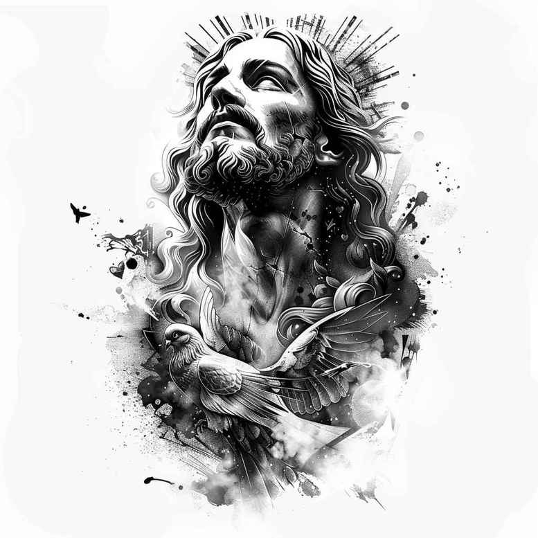 AI-generated tattoo project presents a commanding Jesus portrait rendered in black and grey with painterly ink splashes and a subtle halo. The composition centers on the figure’s serene gaze and open hands, suggesting mercy, blessing, and a sacred presence that invites quiet contemplation. Ink accents twist around the form like storm-light and clouds, creating a dramatic balance between the solidity of the figure and the kinetic energy of the surrounding splatter. The piece leans toward a realistic approach in grayscale, with carefully tapered shading, soft transitions, and speckled texture that add depth to the chest and beard while preserving negative space to keep the focus on the face. The halo anchors the divine aura, while the surrounding pattern-like splashes evoke a sense of rain, light, or rain of grace—an emblem of faith poured over the wearer. The design is consciously suited to cover-up scenarios: the dense black fields and layered shading offer effective camouflage for older tattoos while preserving the integrity of the sacred icon. When inked on the upper arm, back, or chest, this concept reads as a monumental, timeless symbol of sacrifice, compassion, and redemption. It also functions as a personal meditation on faith, hope, and protection. The piece blends traditional sacred imagery with contemporary tattoo techniques—bold silhouettes, fine gravity lines in the face, delicate line work, and a painterly edge achieved through stippling and soft gradients. Its AI-generated origin reflects modern explorations of sacred iconography in tattoo art, while the overall mood remains reverent and introspective. It remains a highly meaningful tattoo option for anyone seeking a powerful, reverent piece that can evolve with age and skin as a centerpiece of devotion; its dark foundation makes it especially suitable for cover-up, allowing new narratives to emerge over older marks. Keywords abound: tattoo, tattoo design, meaningful tattoos, black and grey, realistic tattoo, cover-up, pattern, sacred, jesus.