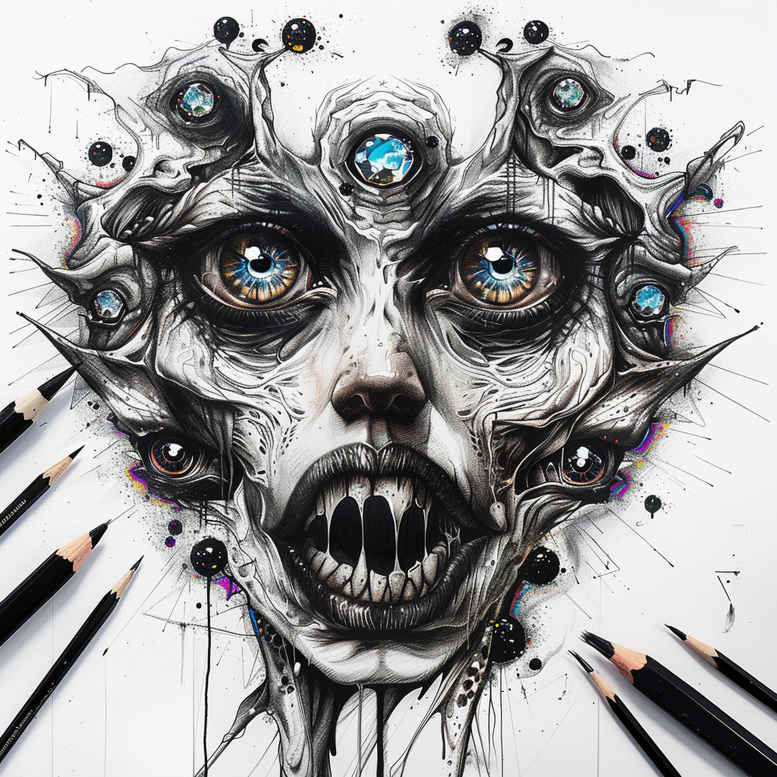 AI-generated tattoo project exploring a dark, cover-up ready skull and mask motif, rendered with dense black ink and fine-line precision. The central design fuses a skull-like visage with a ceremonial mask, dominated by high-contrast black and grey shading and interspersed with crystalline blue gems that draw the eye. Delicate linework weaves around the form, creating an ornamental, graphic pattern that reads as a single cohesive tattoo design suitable for a bold body art statement or a strategic cover-up over an existing tattoo. The composition relies on symmetry and negative space to enhance depth, with teeth and jaw forms emerging from the void, while the gleaming gems provide punctuations of color. The surrounding pencils in the image emphasize the draft-like nature of the concept, underscoring that this is a design study, an AI-generated tattoo project intended for refinement into a real piece. Key elements: mask, skull, eye, teeth, gem, pencil; style: fine line; color palette: black and grey with blue accents; motifs: pattern, skull motif, ornamental detail, realistic shading; potential symbolism: mortality and resilience, transformation through ink; this approach aligns with tattoo design practices for meaningful tattoos, including small to medium scale work, black and grey realism, and fine-line execution. As a complete package, this concept is ideal for a cover-up, leveraging dense black areas to conceal older work while preserving intricate detailing for a striking new tattoo design.