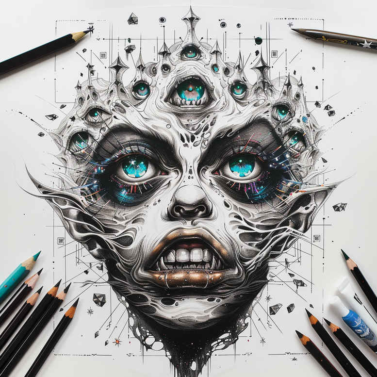 An AI-generated tattoo project featuring a surreal portrait of a face adorned with three eyes across the forehead. Executed in black and grey with fine line technique, the design relies on meticulous linework, stippling, and heavy shading to create depth. Ornate details around the crown and a fractured, crystalline motif frame the face, producing a visually dense composition that invites a larger canvas. The central motif—three eyes—evokes inner vision, vigilance, and symbolic insight, a theme that translates well into tattoo design as a personal talisman or meaningful tattoos. The high-contrast grayscale palette ensures strong readability on the skin, while the soft gradations between solid blacks and pale grays support a realistic tattoo aesthetic within a Japanese style tattoo or tribal tattoo sensibility, depending on interpretation. The image includes visible pencils at the periphery, underscoring its origin as a concept sketch and its suitability for a custom tattoo design session. Because the piece is very dark with heavy shading, it is presented here as a perfect cover-up concept: the density of black ink can effectively mask previous work or scars when placed on a suitable area, and the three-eye motif can be scaled to fit larger body surfaces. The design can be translated into fine-line or bolder blackwork styles, and it can be adapted for black and grey realism or stylized graphic ink. It also provides opportunities to incorporate additional motifs such as lotus flower tattoos or infinity symbols for deeper meaning. This is an AI-generated tattoo project that demonstrates how a complex pattern-heavy portrait can function as a meaningful tattoo design, combining geometric precision with organic linework to create a unique piece for the wearer.
