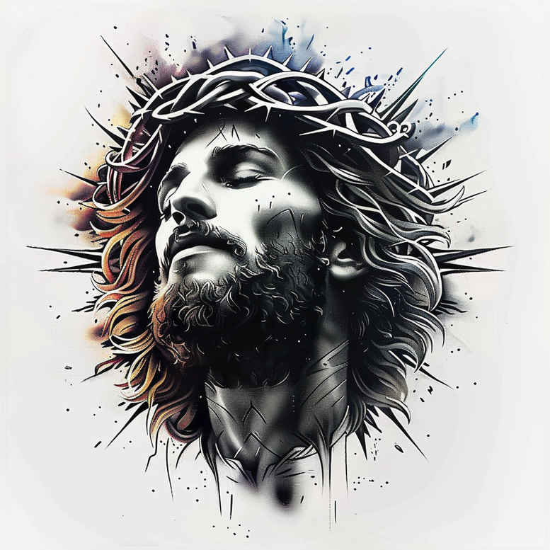 An AI-generated tattoo project presents a black and grey watercolor-style portrait of Jesus crowned with thorns. The composition centers on a steadfast gaze and sculpted features, with careful chiaroscuro defining the brow, cheek, and jaw, while the crown threads its thorns around the temples. Hair falls in ink-soft strands, and the robe folds sit heavy and dignified beneath, grounding the figure in timeless sacred iconography. Surrounding splatter elements and subtle luminosity evoke a modern halo, lending movement to the piece without distracting from the spiritual focus. The technique blends realistic shading with painterly washes to achieve depth on skin, a hallmark of black and grey realism and contemporary body art. Symbolically, the crown of thorns honors sacrifice and redemption, while the calm expression communicates mercy and kingship, aligning with the Christian message of grace. The design is deliberately cover-up-friendly: its dense shadows and bold contours maintain legibility on darker skin tones and larger canvases, while the splatters and negative space can be tuned to conceal prior tattoos if desired. For wearers seeking meaningful tattoos, this tattoo design functions as a powerful tribute to Jesus, suitable for back, chest, or shoulder placements and adaptable to a finer line rendition if needed. The concept embraces tattoo culture language—custom tattoo design, black and grey, realistic tattoo, and ink—without sacrificing reverence or clarity. It invites collaboration to adjust line weight, contrast, and placement to suit typography, skin tone, and anatomy, ensuring a lasting, impactful piece that speaks to faith, devotion, and heritage. In sum, this is a compelling, AI-generated tattoo project that marries sacred symbolism with modern technique, offering a cover-up-ready portrayal of Jesus Christ.