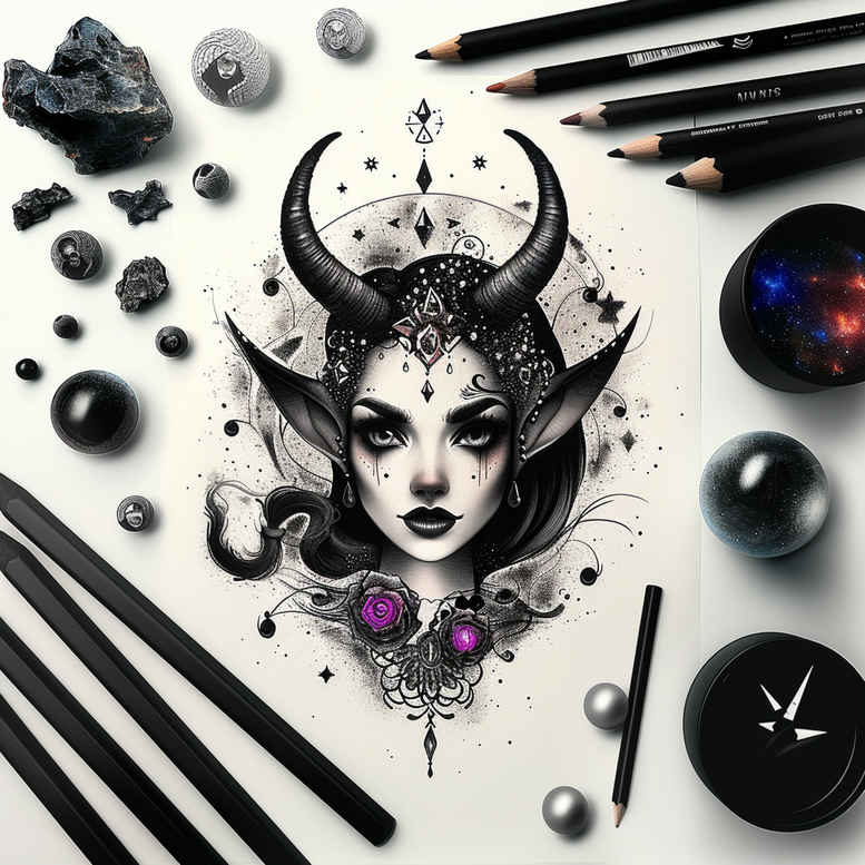 This AI-generated tattoo project presents a horned goddess portrait rendered in a disciplined black and grey palette with a refined fine line technique. The central figure is a woman crowned by an ornate horned headpiece, her tranquil gaze set against a field of controlled shading, while a delicate necklace with purple gems provides a vivid color anchor. The surrounding composition emphasizes ornamental patterning, with symmetrical linework, filigree motifs, and interlaced curls that form an intricate pattern across the piece. Negative space and measured tonal variation create depth without sacrificing legibility when inked at various sizes, making it suitable for small tattoos or larger placements. Symbolically, the horned goddess evokes protection and strength, the gems signify inner worth, and the repeating motifs nod to Japanese and tribal tattoo traditions while remaining contemporary in fine line style. This concept functions as a meaningful tattoo design and can serve as a cover-up template for clients seeking to mask older ink in the right placement. The AI origin reflects modern ideation processes, offering a curated starting point that can be adapted by a skilled artist into a custom tattoo design. In terms of SEO and audience reach, the description foregrounds tattoo, tattoo design, meaningful tattoos, fine line tattoo, black and grey, lotus flower tattoo motifs, infinity tattoo ideas, tribal tattoo, rose tattoo design, small tattoos, flower tattoos, custom tattoo design, Japanese style tattoo, and body art ink to help clinicians and clients connect with this pattern-driven portrait. The palette preserves a monochrome backbone while the purple gems act as a strategic focal point, ensuring the piece remains legible on skin and practical to ink.