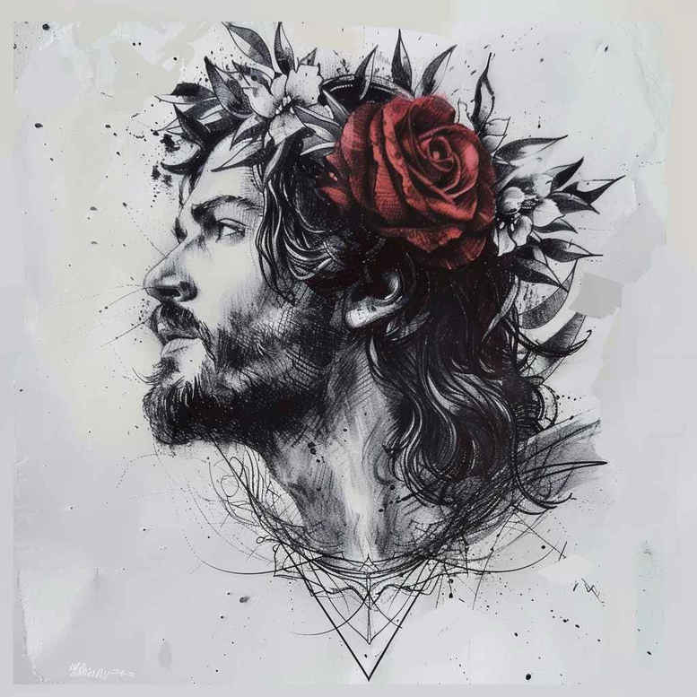 This AI-generated tattoo project presents a contemplative Jesus portrait rendered in fine-line black and grey. The design centers on a profile of Jesus, with a crown formed not of thorns but of roses and leaves, symbolizing divine love, sacrifice, and the beauty of faith. A subtle geometric triangle under the chin adds a modern sacred geometry accent, suggesting balance and the Trinity. The shading relies on delicate line work, stippling, and cross-hatching to create soft transitions and lifelike depth, while maintaining the crisp clarity required for a refined tattoo design. The composition emphasizes the face and crown, allowing the eye to trace the temple, jawline, and beard, while the rose crown frames the profile with organic movement and a gentle contrast against the hair. The piece adapts well to forearm, upper arm, or chest placements, scaling from small to medium sizes; as a cover-up option, it can be blended into existing dark lines with careful grey blending to preserve the new image’s contrast. The black-and-grey palette makes it versatile for professional settings and keeps the focus on form and emotion rather than color. Symbolically, the roses are a nod to Christ’s compassion and the transformative love of faith, while the crown-of-roses evokes sacrifice without the harshness of a thorn crown; the triangle hints at sacred geometry and divine proportion, reinforcing themes of unity, eternity, and the Holy Trinity. The result is a timeless yet contemporary tattoo design that blends religious iconography with minimalist geometry, suitable for meaningful tattoos that speak to devotion and personal narrative.
