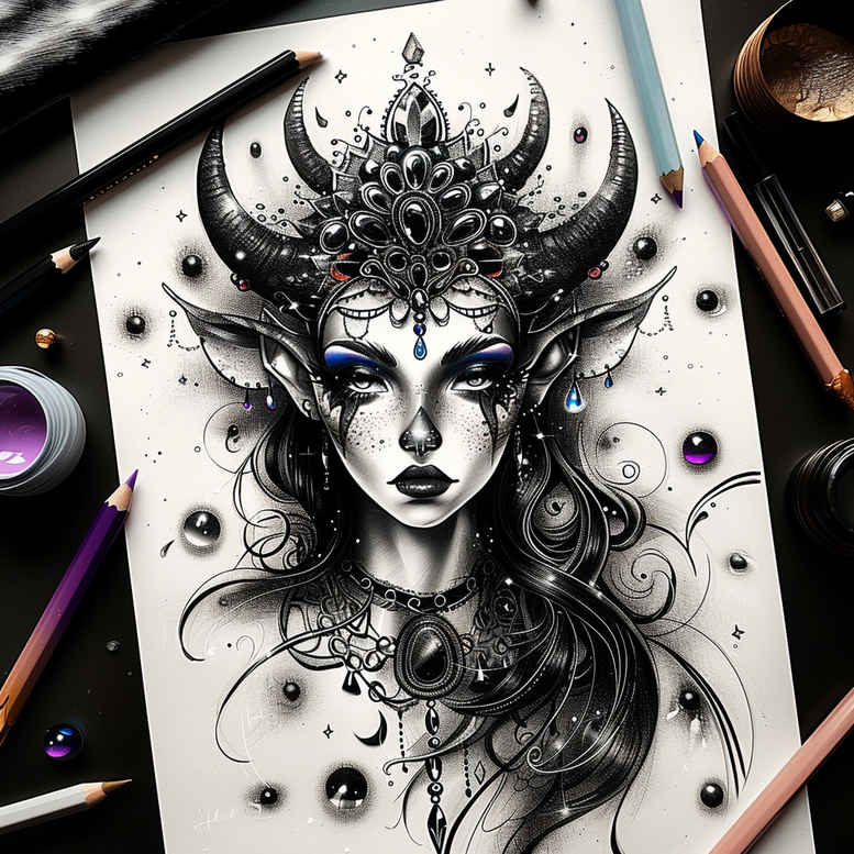 From an editorial standpoint, this large-scale, AI-generated tattoo concept demonstrates how a single composition can cover older ink while delivering a timeless image. Rendered in black and grey realism, the central figure is a regal woman whose calm gaze anchors the design. She wears an ornate horned headpiece, with horns curling into flowing filigree that threads around the face and neck, forming a crown of night and power. Gem accents catch light at careful junctions in the headpiece, providing restrained focal points that stay legible at distance. The hair fans outward into decorative pattern work that frames the portrait and extends into the surrounding negative space, creating motion and depth. The piece reads as a tattoo design that blends portrait realism with symbolic ornament, drawing on lines and motifs that recall Japanese style tattoo and tribal tattoo influences while maintaining a strictly black and grey palette. For meaning, the motif speaks to empowerment, transformation, and resilience—an ideal fit for meaningful tattoos and custom tattoo design briefs. Technically, the approach would emphasize fine line tattoo precision for the crown’s lace-like details, smooth gradation on the face, and subtle stippling for shadow and texture. Pattern work along the outer fields ensures contrast and legibility on larger skin surfaces, making it suitable as a cover-up for dark prior ink while still reading clearly as a standalone body art piece. Placement considerations include back, thigh, or rib cage, where the vertical sweep of the crown and filigree can align with anatomy, and where gem highlights can provide quiet sparkle. In short, this AI-generated tattoo project offers a bold yet refined portrait solution, combining realism with intricate patterning to create a timeless tattoo design that can be scaled for small tattoos or expanded into a sleeve; the design nods to lotus flower tattoo, rose tattoo design, infinity tattoo, and flower tattoos, and it embraces the broader vocabulary of ink, meaning, and art, aligning with the ideas of meaningful tattoos, custom tattoo design, and Japanese style tattoo, while remaining a black and grey realism piece.