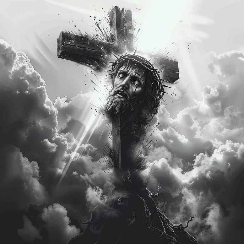 An AI-generated tattoo project in a somber black-and-grey palette, this composition centers on Jesus crucified atop a weathered cross, set against a turbulent sky pierced by radiant light. The design embraces traditional religious iconography while translating it into a contemporary tattoo design with cinematic depth. The cross stands as a vertical spine, while the figure of Jesus is rendered with careful tonal gradation to convey weight, sorrow, and endurance without sacrificing readability on skin. Cloud banks drift around the scene, providing negative space that enhances contrast and invites contemplation. Subtle highlights along the shoulders, crown of thorns, and hands create fine line detail that elevates the realism without becoming overly graphic, making it suitable for a variety of placements. This piece leans toward black and grey realism, using smooth shading and delicate linework to achieve a sense of movement within stillness. The symbolism is deliberate: the cross represents sacrifice and redemption, light breaking through clouds signifies hope beyond suffering, and the downcast gaze invites personal reflection. For tattoo enthusiasts seeking meaningful tattoos, this design balances reverence with artistry, offering a powerful narrative in a compact, wearable form. The project demonstrates how a classical religious motif can be reframed for modern body art, while staying respectful and evocative. Because the image is very dark, it doubles as an excellent cover-up candidate for someone seeking to replace an earlier, more aggressive piece with a timeless spiritual statement. This concept is presented as an AI-generated tattoo project, suitable for practitioners and clients exploring a large-format black and grey scene with a contemplative mood. Keywords to consider include tattoo, tattoo design, meaningful tattoos, fine line tattoo, black and grey, realistic tattoo, cross tattoo design, and religious iconography; the approach favors clean silhouettes with nuanced shading that translates well to real-world skin texture and aging.