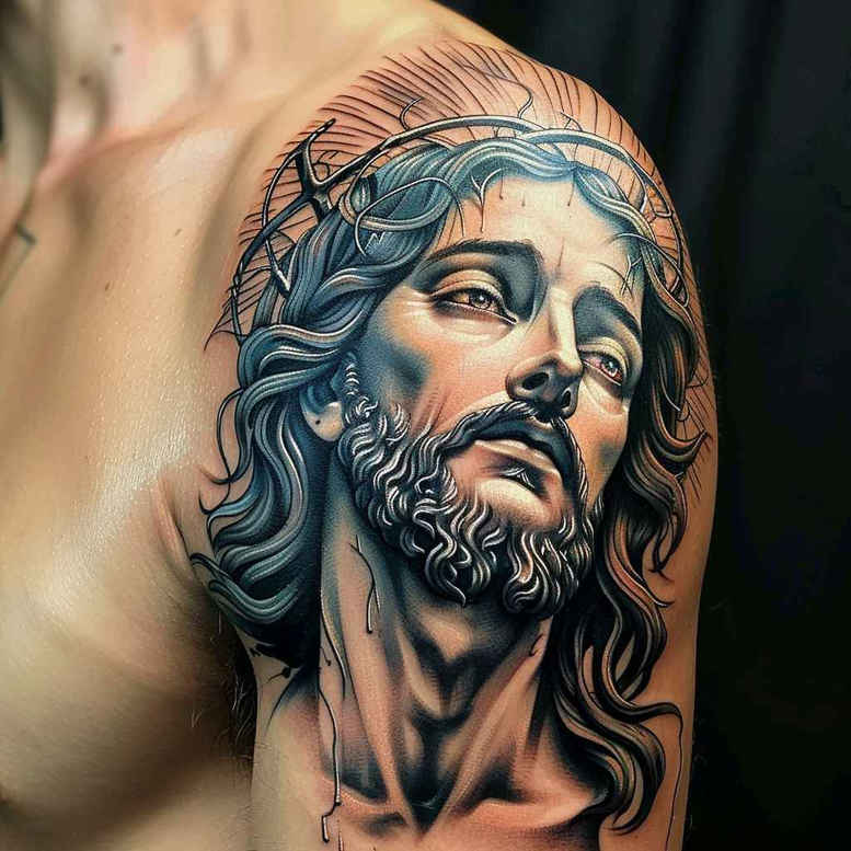 An AI-generated tattoo project presenting a sacred Jesus portrait rendered in black and grey with a cool blue undertone. The design merges reverent iconography with modern realism, capturing a serene gaze, the dignified line of the nose, and the texture of hair as it cascades around the crown of thorns. The crown itself sits as a poignant symbol of suffering and sacrifice, while the blue-tinted shading lends a contemplative, ethereal quality that communicates divinity without overpowering the facial expression. Executed on the shoulder canvas, the piece uses smooth gradients and controlled contrast to create depth, allowing the portrait to breathe with the natural contours of the body. Fine line work defines delicate features—lids, brow, and lips—while broader shading around the jaw, neck, and collarbone anchors the image in mass and form. The effect is a statement piece that honors faith with understated elegance, suitable for individuals seeking a meaningful tattoo design that remains timeless with age. From a technical standpoint, the workflow prioritized clean line clarity at mid to large sizes, with careful layering to preserve skin tone transitions when ink settles. The result is a realistic tattoo look that reads well in both black and grey and moody blue undertones, enabling versatility for future color accents if desired. This project is a strong example of how AI-generated tattoo projects can support traditional tattoo artistry, offering a polished reference for a custom tattoo design, a collection-worthy portrait that conveys spirituality, resilience, and hope. The composition benefits from a restrained palette, with the crown of thorns providing texture and contrast that guides the eye toward the gaze, while the flowing hair adds motion and rhythm. The piece reads clearly from a distance and rewards close inspection with nuanced shading and skin-tone realism, making it adaptable for a religious sleeve or a singular focal point. In the broader context of tattoo culture, this design demonstrates how digital generation can complement hand-crafted ink, yielding a refined template for clients seeking a timeless, meaningful tattoo design that honors Jesus and Christian symbolism. Keywords sprinkled throughout the narrative include tattoo, tattoo design, meaningful tattoos, fine line tattoo, lotus flower tattoo, infinity tattoo, tribal tattoo, rose tattoo design, small tattoos, flower tattoos, custom tattoo design, Japanese style tattoo, black and grey, realistic tattoo, body art, and ink.